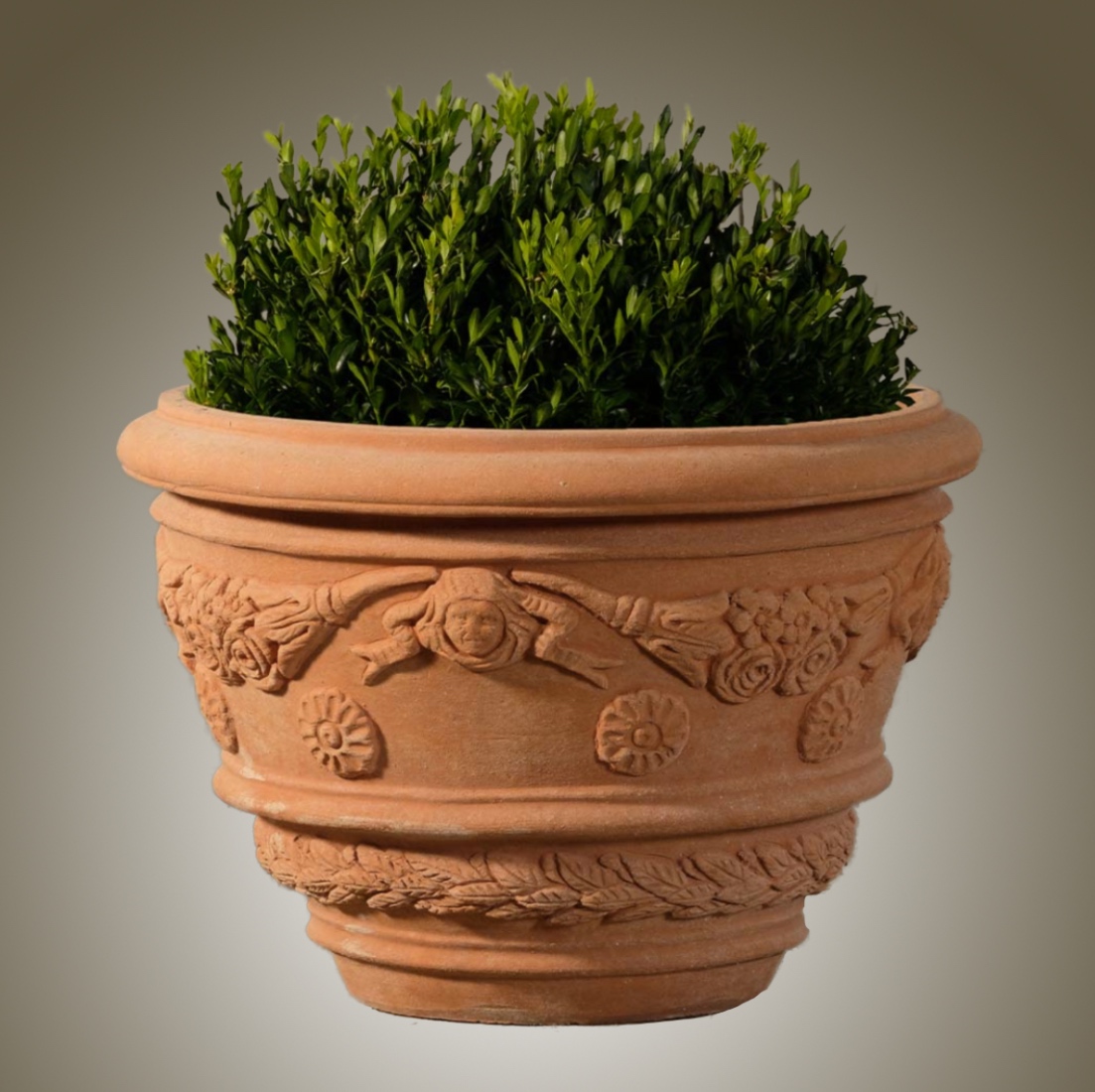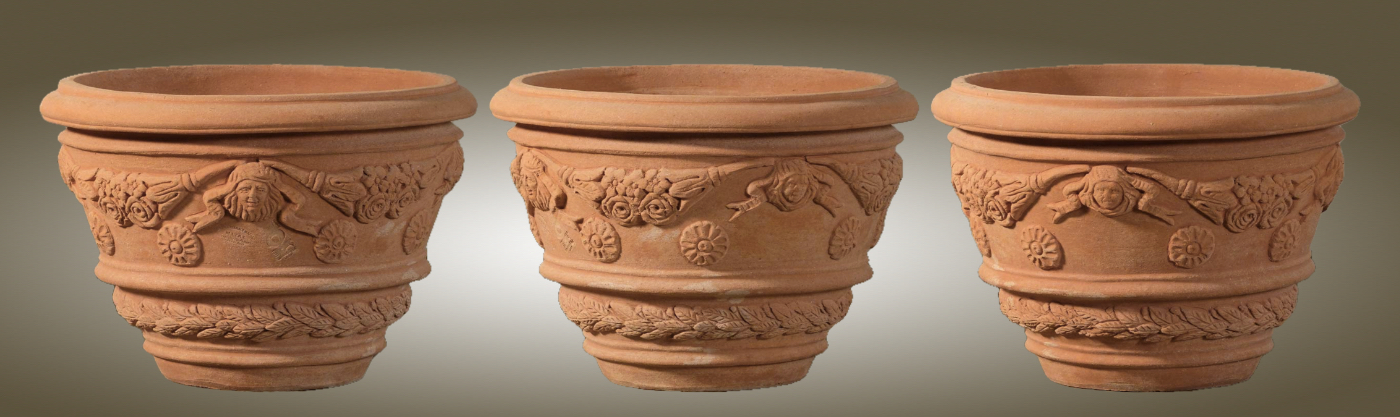 The bowls of our Large Agresti Vase are made freehand like our Artisan Rolled Rims. The masks, rosettes and garlands that adorn them are formed in the original molds from the 19th Century Agresti workshop. These terra cotta urns were originally made in the 1880Ős for Biltmore Estate in Asheville, NC where they still remain today.