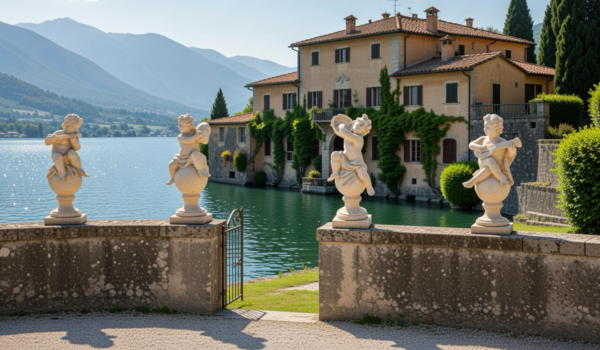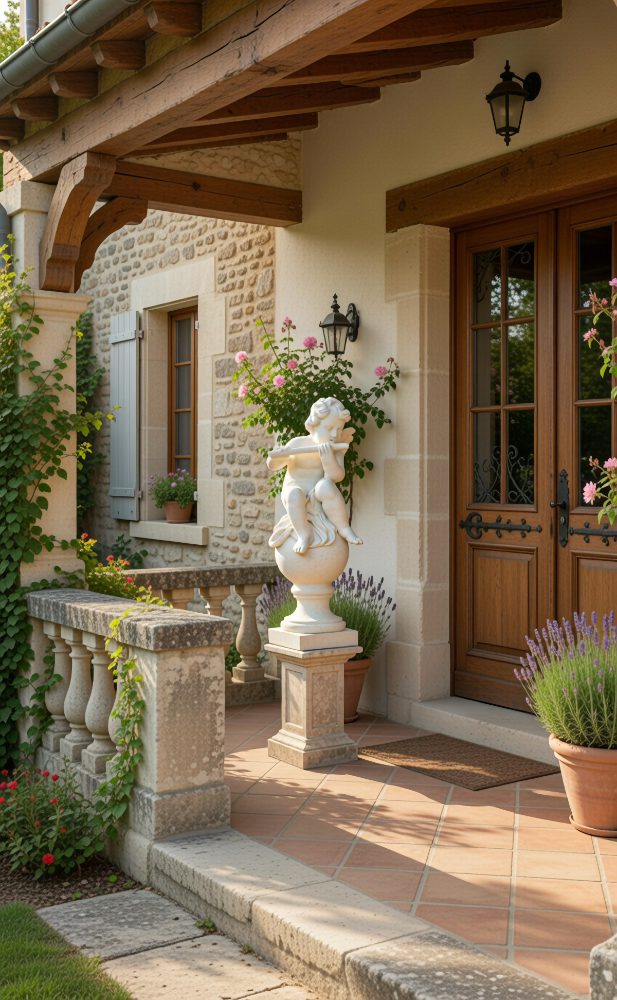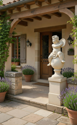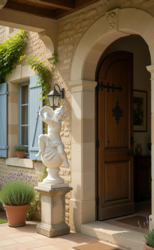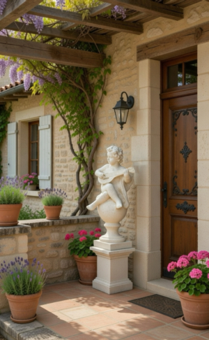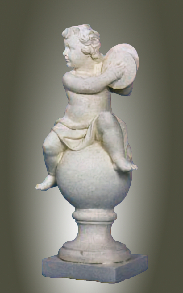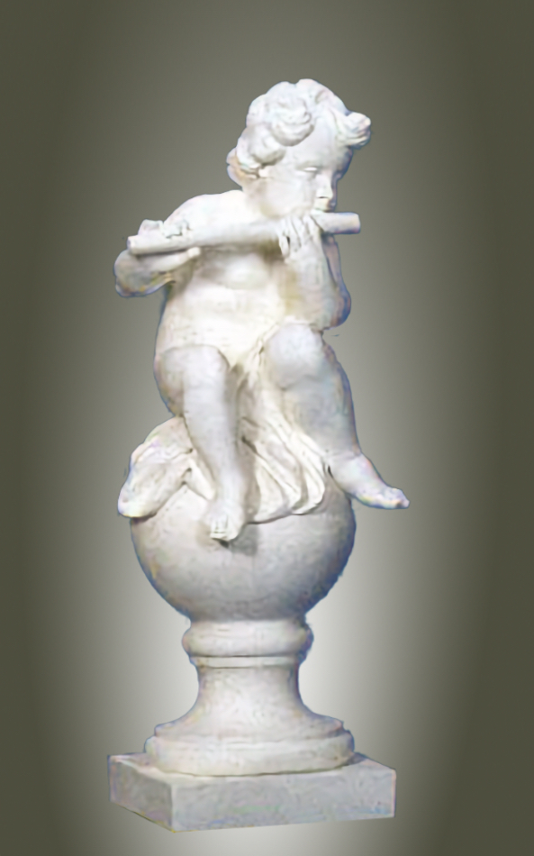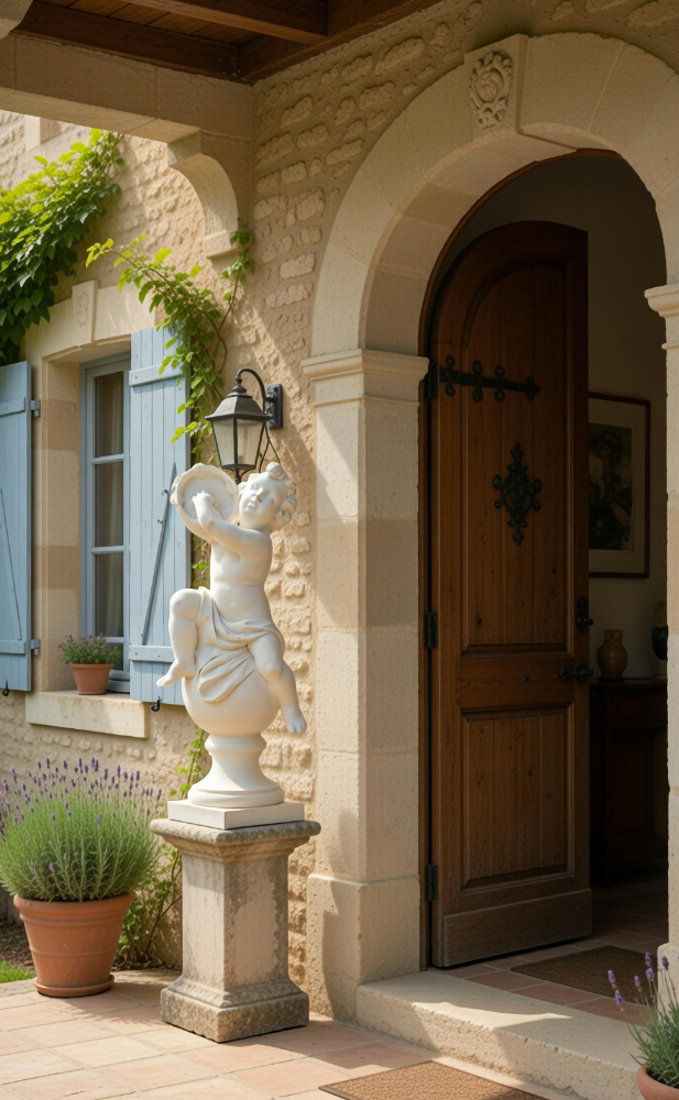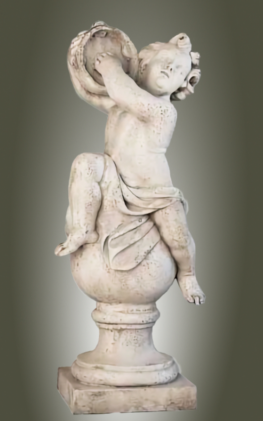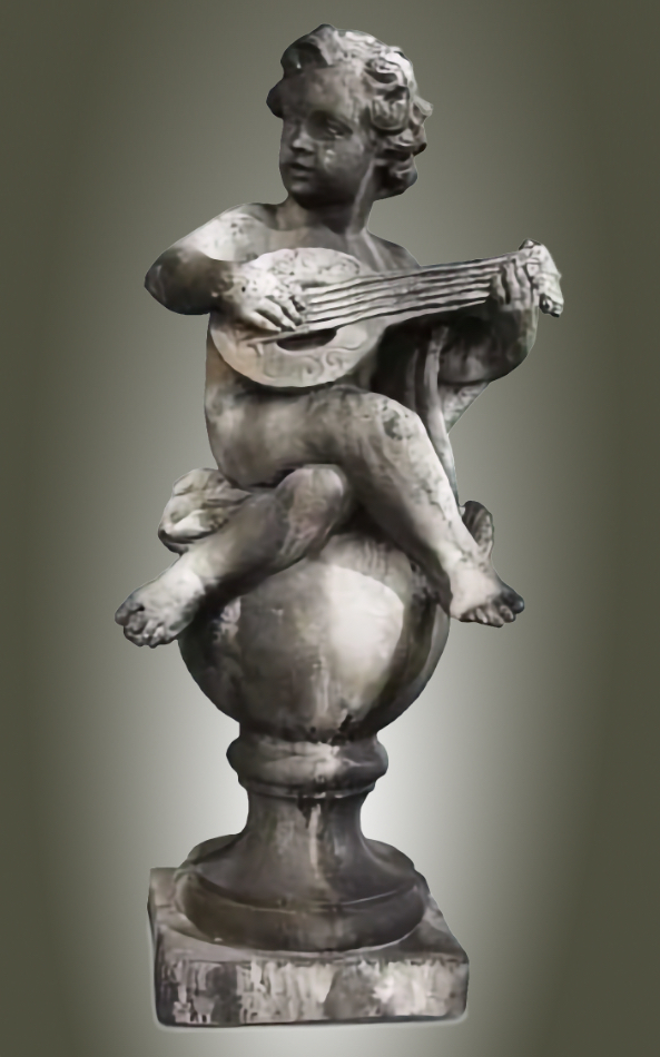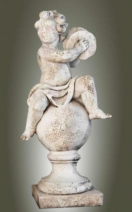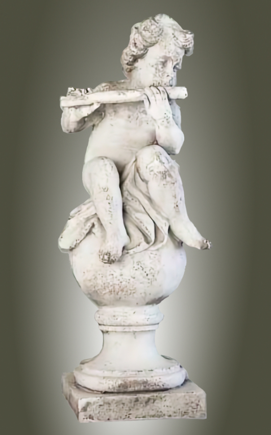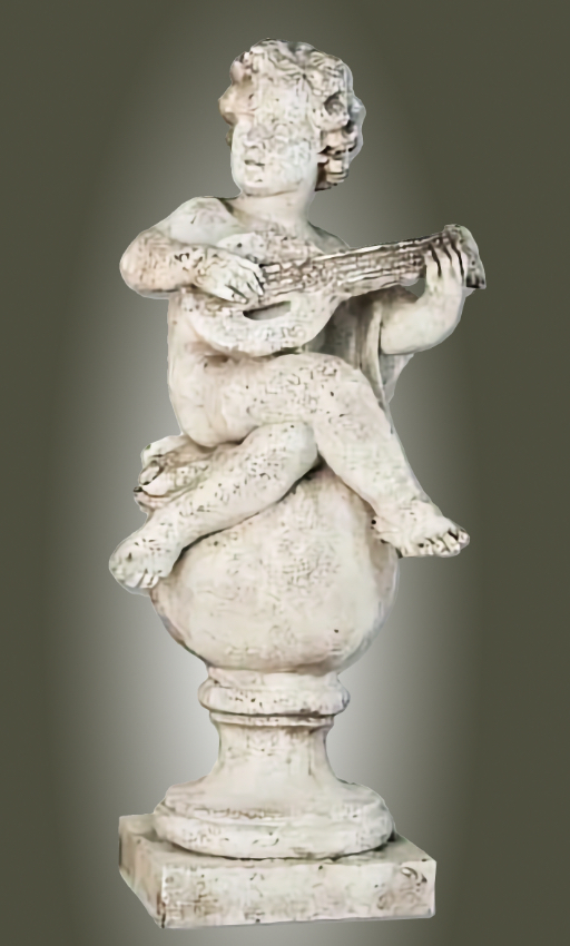 Placing your 39-inch tall Angelic Ensamble Finial Sculptures (a charming putti figures playing renaissance instruments while perched atop a ball finial base) on a small pedestal at the entrance to the veranda or by the entrance of a home is a wonderful idea This style draws from timeless European garden and Provenal influencesthink rustic elegance, soft stone tones, weathered patinas, and whimsical classical touches that feel both grand and inviting. The four Sculptures are the Tambourine, Cymbals, Mandolin and Flute. They are all exquisite. The cherub's musical pose adds a playful, romantic whimsy that's perfect for welcoming guests, evoking the spirit of French countryside estates where statuary often graces entryways, porches, or verandas to create focal points of charm and artistry. This distinctive sculptures are hand cast and hand finished in our USA foundry in extremely durable fiberstone. Fiberstone is a mixture of sand and stones cast into the surface to give the appearance of aged stone. Reinforced with a fiberglass backing, it remains lighter and less fragile than concrete. Guaranteed outdoor durability. Shown here in Antique Stone (except where otherwise noted) finish, but, it is also available in all the finishes shown below. Make your finish choice by selecting from the options list below by the "Add to Cart" button. Finishes are hand applied and may vary, making each piece unique.