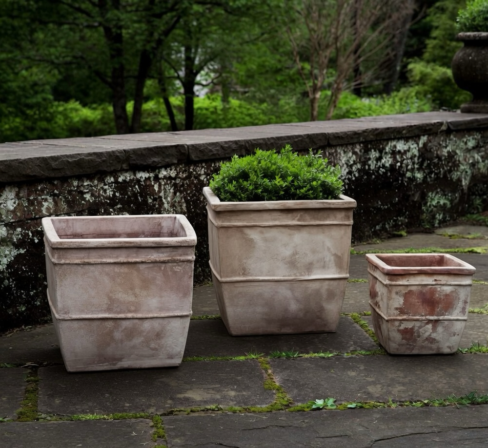 The Antico Square Planters are a set of three gorgeous square top tapered terra cotta box planters with rich, multi-layered Antico terra cotta glazes. Each box has its unique version of the beautiful Antico Terra Cotta glaze thatŐs just stunning. This set of box planters make a beautiful tiered arrangement and are perfect for poolside, verandas, entrances, and pretty much any indoor/outdoor garden setting. You can use them together in a grouping or individually, either way makes a special statement. You can also use them to define a walkway or entrance or as a divider in a larger setting.