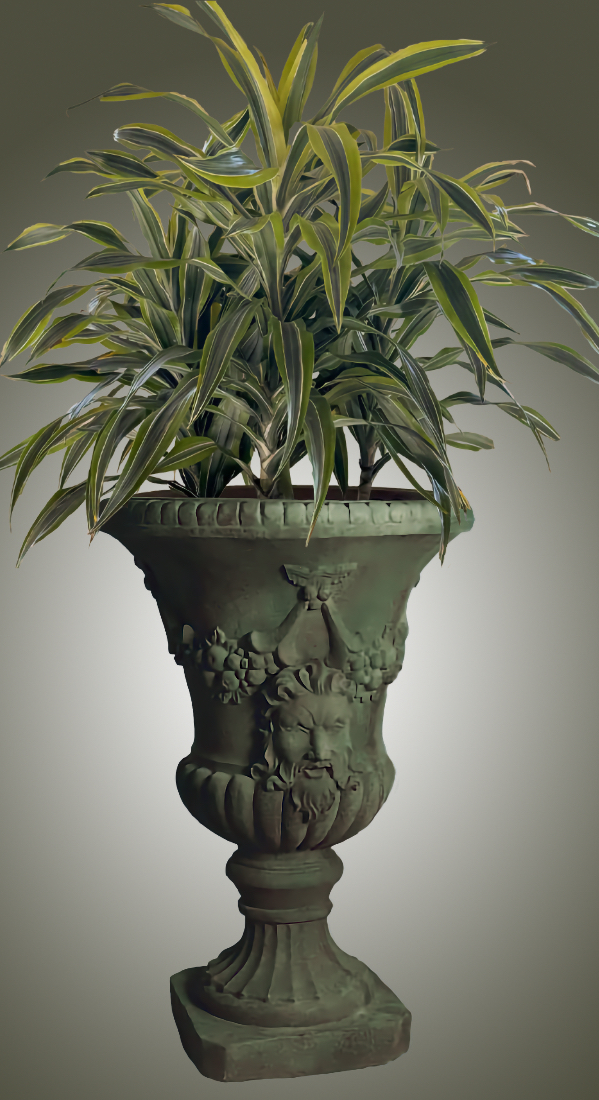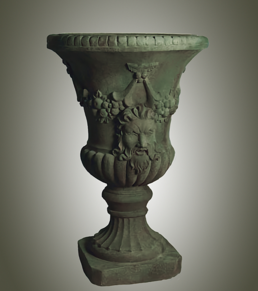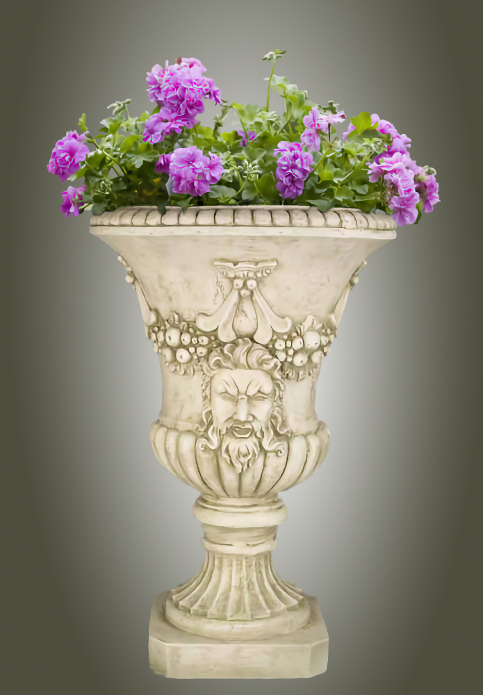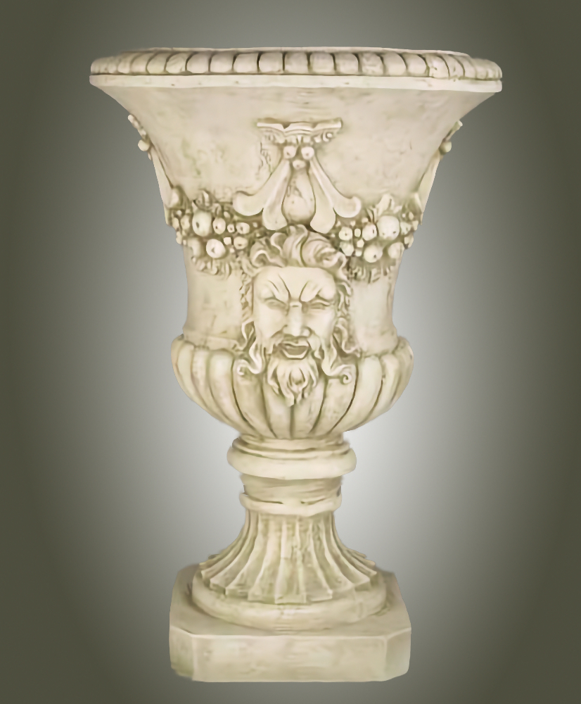 In ancient Greek religion and myth, Dionysus (Ancient Greek: Διόνυσος Di—nysos) is the god of wine-making, orchards and fruit, vegetation, fertility, festivity, insanity, ritual madness, religious ecstasy, and theatre. He was also known as Bacchus (Ancient Greek: Βάκχος Bacchos) by the Greeks (a name later adopted by the Romans) for a frenzy he is said to induce called baccheia. His wine, music, and ecstatic dance were considered to free his followers from self-conscious fear and care, and subvert the oppressive restraints of the powerful. Read More about Dionysus or Bacchus in Wikipedia. This distinctive urn is meticulously hand cast and hand finished in our USA foundry in extremely durable fiberstone. Fiberstone is a mixture of sand and stones cast into the surface to give the appearance of aged stone. Reinforced with a fiberglass backing, it remains lighter and less fragile than concrete. Guaranteed outdoor durability. The Acanthus Ram's Head Urn is shown in Antique Stone and Verde, but, is available in all the colors shown in the chart below. Make your choice by selecting your finish in the finish/colors options list by the "Add to Cart" button. Finishes are hand applied and may vary, making each piece unique.30" H x 20" Diameter FREIGHT NOTE: In the case of extra large designs which exceed FedEx ground requirements and must ship by Freight Carrier, there is an additional Freight/Truck charge based upon your zip code location that will be charged at the time of shipment. Please call with questions 610 649 4078. | |||||||||||||||||||||||||||||||