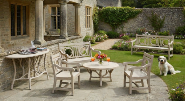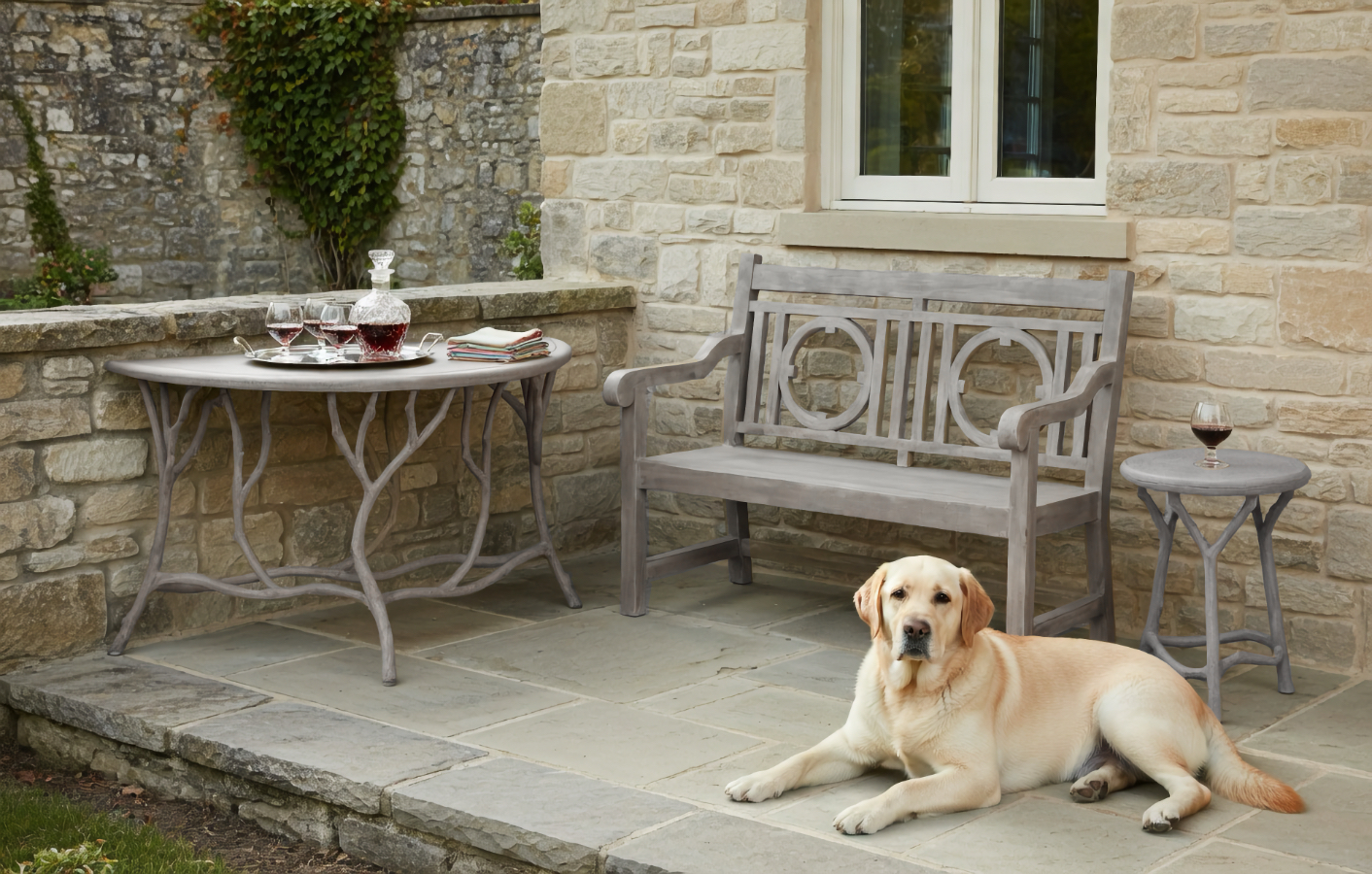 The Bois de Bourbon Faux Bois Console Table with the Devonshire Large Faux Bois Bench, the Devonshire Faux Bois Loveseat, the Bois de Bourbon Faux Bois Cocktail Table and the Bois de Bourbon Faux Bois Side Table/Stool. Together they add magic to any setting.Click to Enlarge