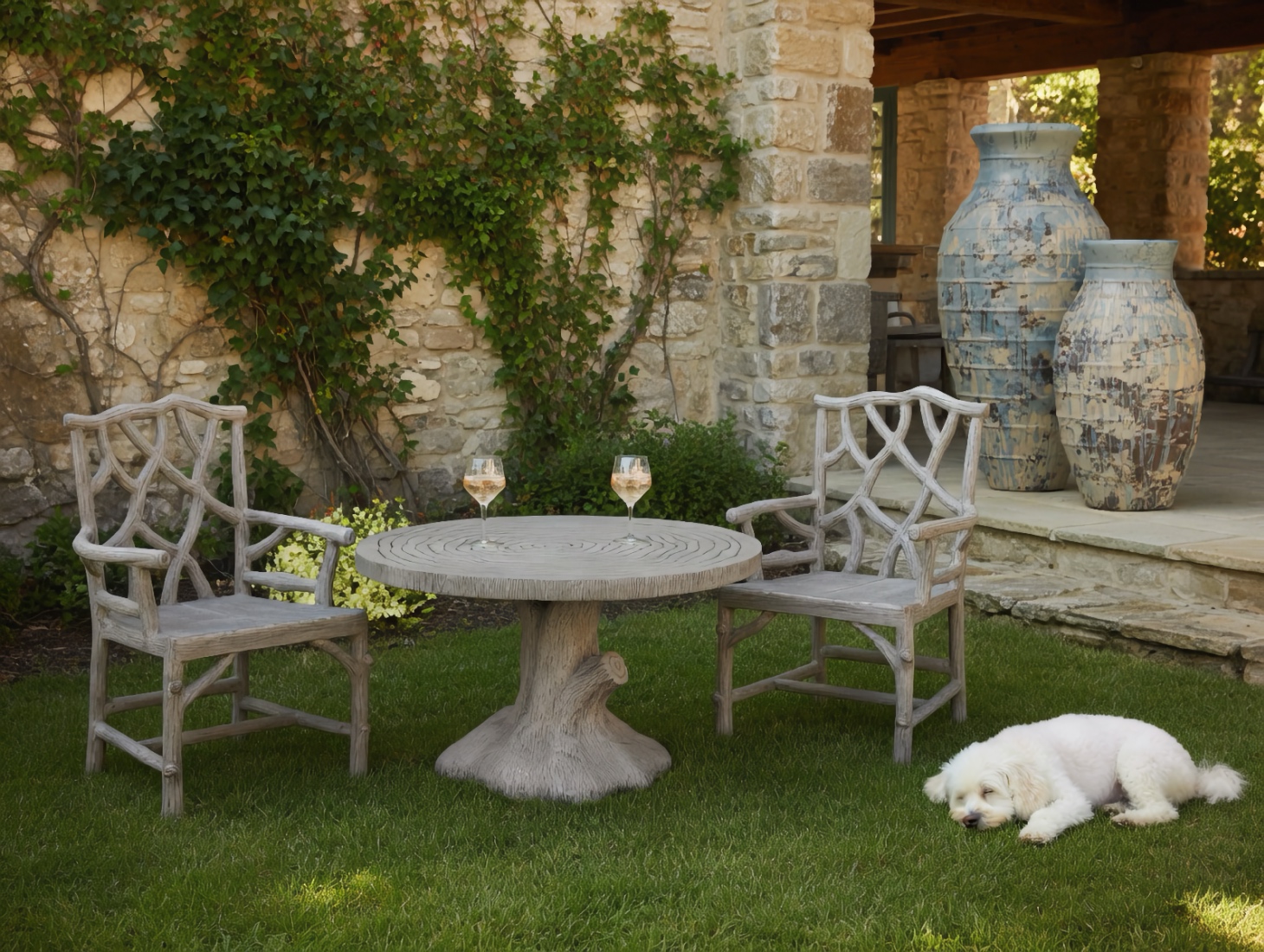 ="A pair of Bois de Fontanilles Arm Faux Bois Chairs are complemented by the Chambord Faux Bois Cocktail Table. A set of exquisite Ariana Antique Urns, adorned with their distinctive Blue Drip glaze, are positioned behind on the veranda. Fifi is peacefully resting on the lawn. This ensemble exemplifies understated elegance and sophistication.Click to Enlarge