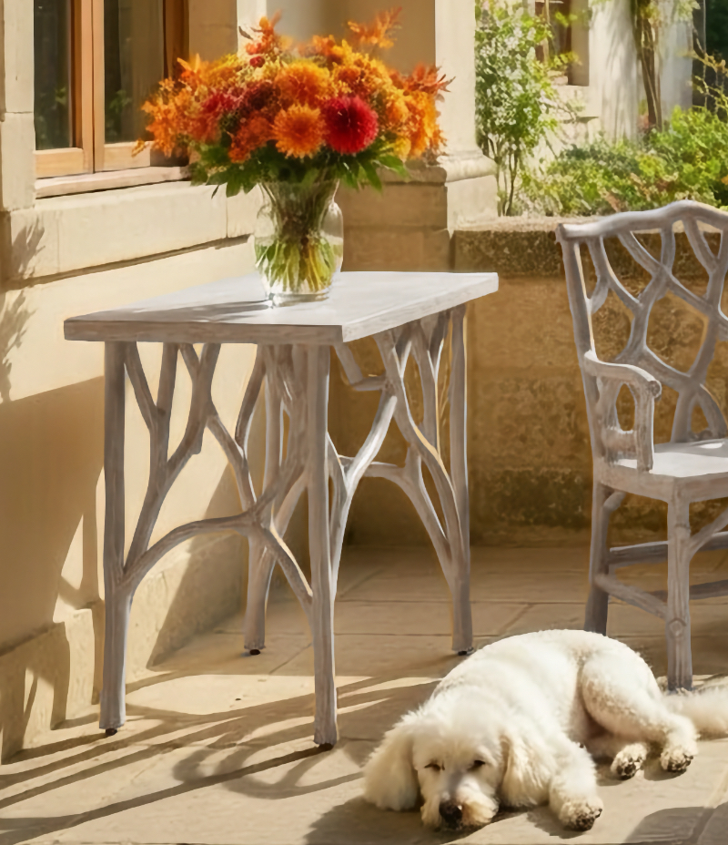 Using the Brookside Branch Faux Bois Table/Bench as a beautiful bench with the Brookside Branch Faux Bois Side Table on the left with the Bois de Fontanilles Arm Faux Bois Chairs and the amazing Town & Country Faux Bois Coat Tree. Together they make an incredible and welcoming setting.Click to Enlarge