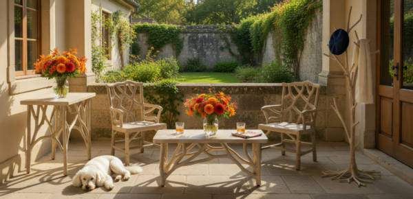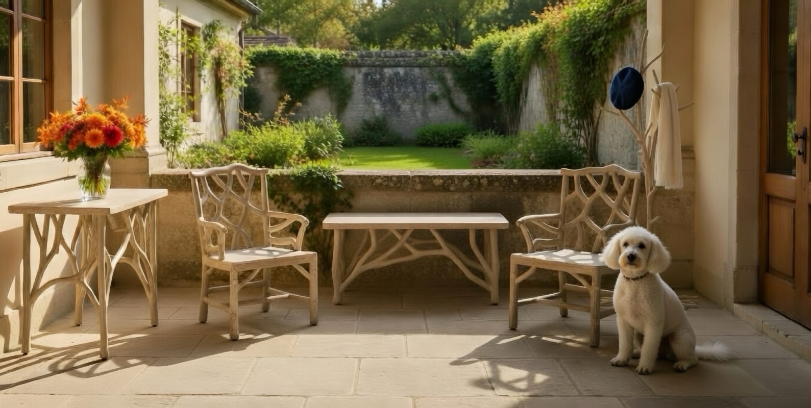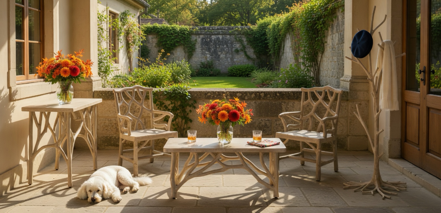 Using the Brookside Branch Faux Bois Table/Bench as a beautiful cocktail table with the Brookside Branch Faux Bois Side Table on the left with the Bois de Fontanilles Arm Faux Bois Chairs and the amazing Town & Country Faux Bois Coat Tree. Together they make an incredible and welcoming setting.Click to Enlarge