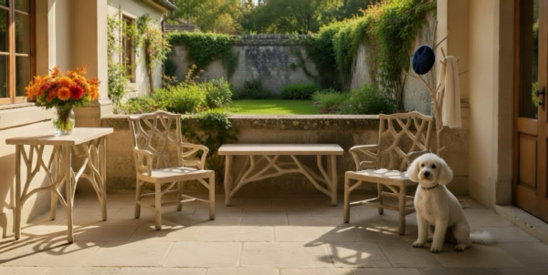 Using the Brookside Branch Faux Bois Table/Bench as a beautiful bench with the Brookside Branch Faux Bois Side Table on the left with the Bois de Fontanilles Arm Faux Bois Chairs and the amazing Town & Country Faux Bois Coat Tree. Together they make an incredible and welcoming setting.Click to Enlarge