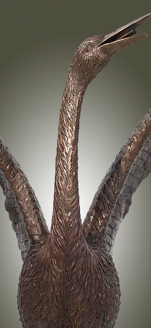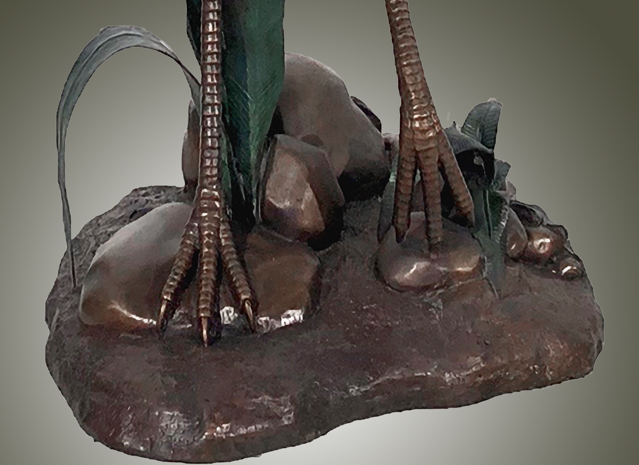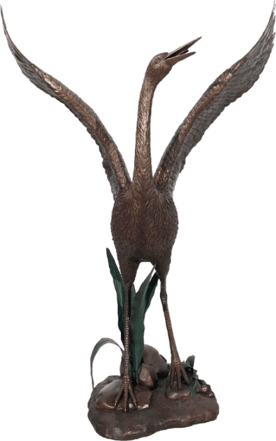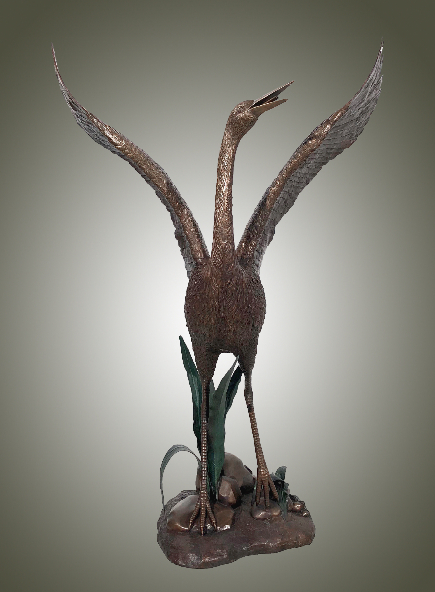 The Bronze Prancing Heron is cast by the traditional, Lost Wax Bronze Casting method (links to a full description of the method). This labor intensive and time consuming method of casting bronze statues, ensure pristine quality and vivid detail. This Bronze Prancing Heron features intricate, hand forged details with a beautiful brown fire-applied patina. Applying patina to bronze using the French method (fire and heat) is an age old traditional skill requiring expert craftsmanship. Each patina is hand applied and the patination result may vary making each sculpt unique. All bronze statuary will develop a natural patina when left in natures elements. The aged patina on bronzes is often desired, but can be prevented by care and cleaning of the bronze statue by applying beeswax or other polish to prevent a patina from forming. The Majestic Heron In Reeds is available in the Classic French Brown Bronze patina as shown. 24" W x 21" D x 48" H Weight: 80 lbs. NOTE: Freight Shipping included with this design. |