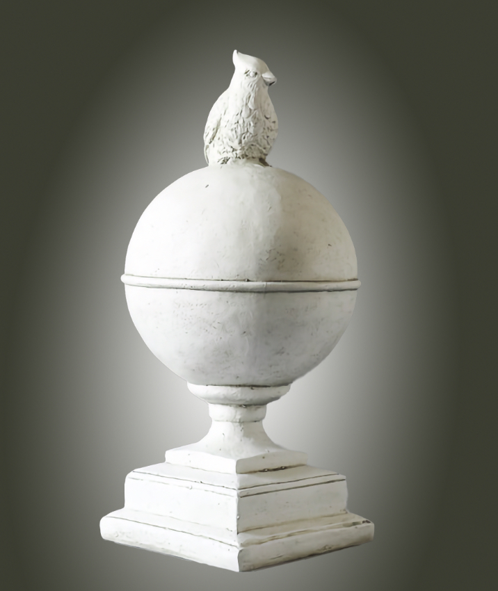 Our Cardinalis Finial is an elegant globe finial with a cardinal bird perched on top. It is a beautifully executed design of one of nature's most recognizable beautiful birds, that makes it a standout sculpture as well as a wonderful architectural accent for your home, study or garden. This distinctive Finial is meticulously hand cast and hand finished in our USA foundry in extremely durable fiberstone. Fiberstone is a mixture of sand and stones cast into the surface to give the appearance of aged stone. Reinforced with a fiberglass backing, it remains lighter and less fragile than concrete. Guaranteed outdoor durability. Shown in White Moss and Classic White, but, is available in all the colors shown in the chart below. Make your choice by selecting your finish in the finish/colors options list by the "Add to Cart" button. Finishes are hand applied and may vary, making each piece unique. 10" sq. base x 20" H Weight: 5.75 lbs