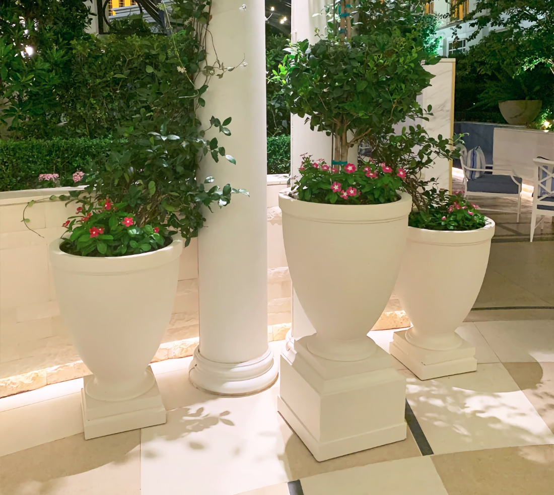 The Capitol Hill Urn is a large estate urn planter with a vase shaped bowl. The bowl has a has a very clean design with a simple squared off rim around the top. The bowl rests on a very short pedestal that flares down to a square base. This urn, because of its understated classic design, will make a statement in traditional and modern settings alike. With its 38" diameter bowl this is a very substantial planter perfect for the veranda or a garden setting, The urn is suitable for tall green shrubs, ivies, and other florals, but, it is also outstanding unplanted. When paired with its matching Rustic 16.5" Pedestal or the Shelbourne Pedestal (sold separately below) the Capitol Hill Urn is an impressive, yet understated architectural feature that can serve as the centerpiece of an entrance drive, garden niche, veranda or entrance foyer. Two urn and pedestals flanking an entrance or defining the corners or edges of a veranda would make an even more impressive statement.