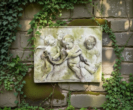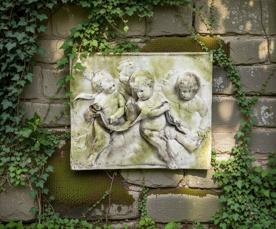 Click to EnlargeOurCherubs Choir Bas Relief is an incredible piece of wall sculpture that is both charming and so well done. Imagine four cherubs holding the score of their next choral piece and discussing its performance.So cute. All this is set in a rectangular plaque that is a little over three wide and almost three feet high. They are perfect for over an outdoor/indoor fireplace, mantle, patio, terrace, or garden wall. This could also be a great addition above a sideboard of a formal dining room. What makes this sculpture so special is the hand-molding and hand-rubbed finishes. No two pieces are exactly alike, just like an aged antique.