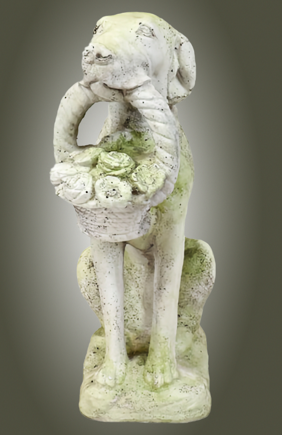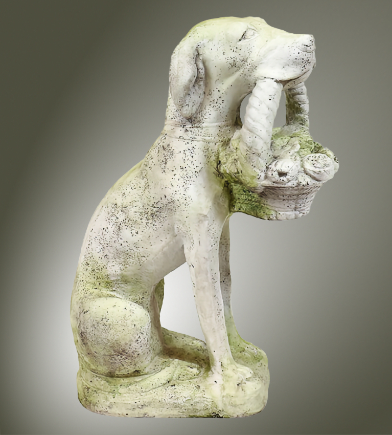 The Classic English Dog with Basket is is a very well executed sculpture, meticulously hand cast and hand finished patina in extremely durable fiberstone. Fiberstone is a mixture of sand and stones cast into the surface to give the appearance of aged stone. Reinforced with a fiberglass backing, it remains lighter and less fragile than concrete. Guaranteed outdoor durability. Shown in Antique Stone, White Moss and Sussex Stone, but, is available in all the colors shown in the chart below. Make your choice by selecting your finish in the finish/colors options list by the "Add to Cart" button. Finishes are hand applied and may vary, making each piece unique. 9" W x 16" L x 24" H | |||||||||||||||||||||||||||||||