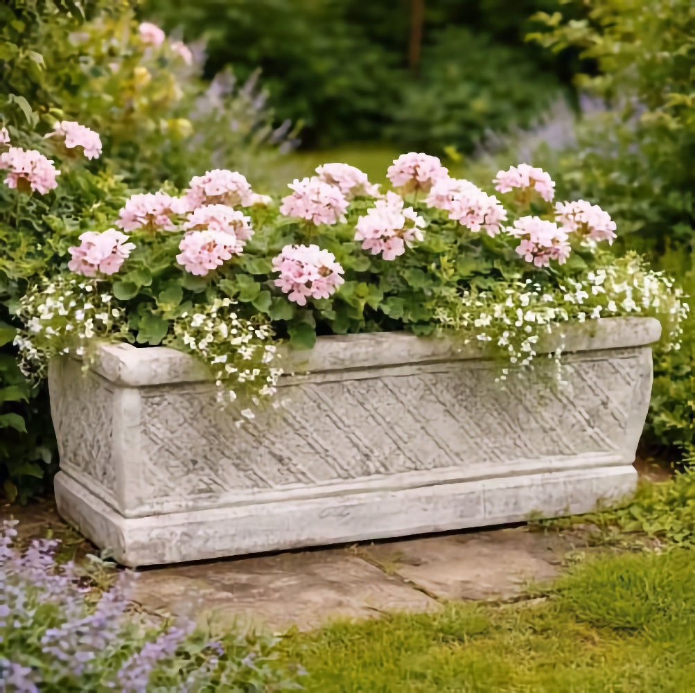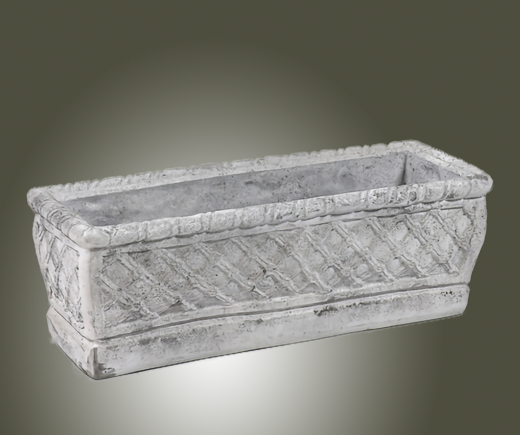 The Coventry Cross Weave Planter is a fantastic low trough planter with a cross weave pattern. It measures two feet long, making it ideal for displaying florals, greens, succulents, or even a herb garden. You can place it on a window sill, a veranda wall, or a garden path edge. This distinctive planter is meticulously hand cast and hand finished in our USA foundry in extremely durable fiberstone. Fiberstone is a mixture of sand and stones cast into the surface to give the appearance of aged stone. Reinforced with a fiberglass backing, it remains lighter and less fragile than concrete. Guaranteed outdoor durability. Shown in Cathedral Stone, but, the Long Lake Faux Bois Planter is also available in all the beautiful finishes shown in the chart below. Make your finish choice by selecting from the options list below. Finishes are hand applied and may vary, making each piece unique.