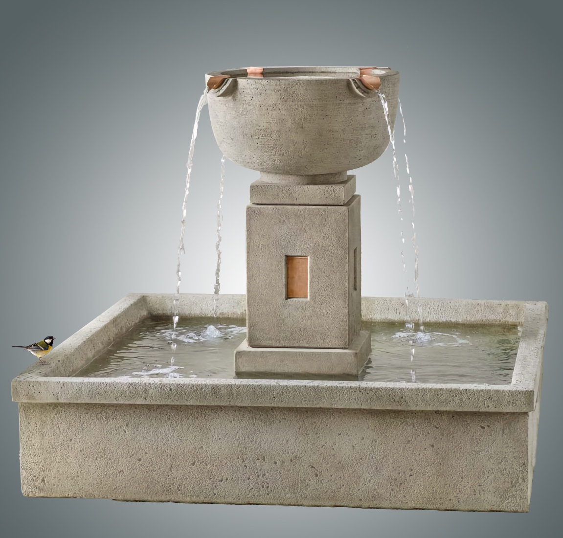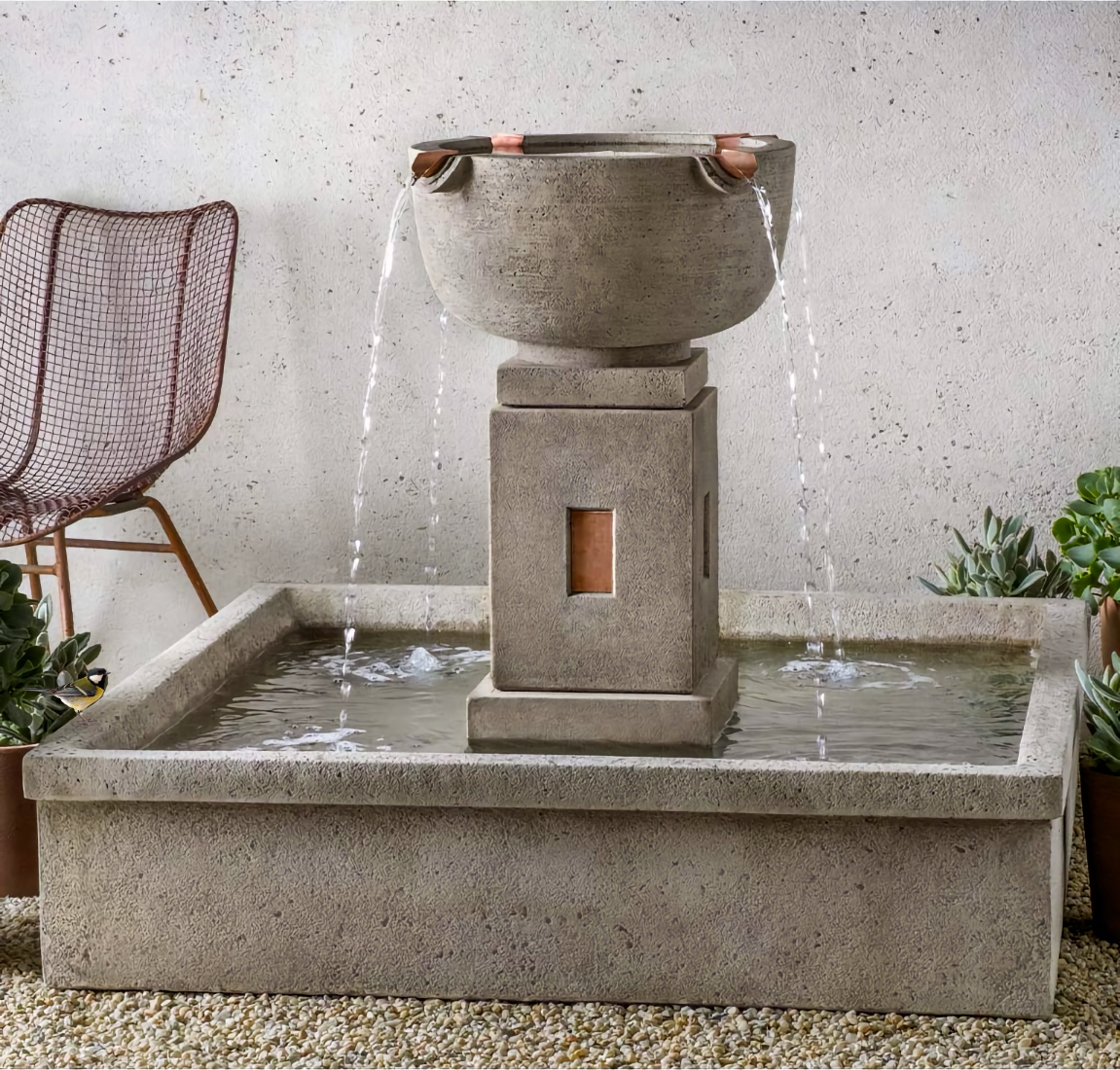 The Edo Fountain is a striking estate fountain that would fit into any modern or contemporary setting. The Edo basin is wider than it is deep and rectangular in shape and the fountain itself is rests on a tall square pedestal with a copper inset on each facing. The top tier fountain bowl at the top is round in shape with four copper raceways spouting water into the large basin below. . The four copper pipes protrude from the sides at the rim of the bowl to provide steady streams of water to flow into the basin below. The large basin can easily double as a Koi pond.