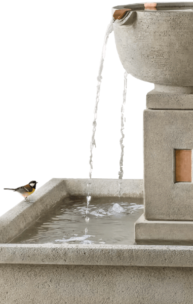 We must stress that this is a large fountain that weighs over 2,500 lbs with water making the La Riviere both very stable and very permanent. This fountain will transform any space with the mesmerizing sounds of water flowing down in steady streams that will lend a serenity to a large terrace, courtyard, lawn or garden setting. It is also visual centerpiece with the deco flavor. This fountain is the perfect device to build a wonderful garden or piazza vignette around and provide a sublime atmosphere for an outdoor social event. The Edo Fountain with its striking design and imposing size has a wow-factor that few other objects possess and it will truly become the proud centerpiece of your garden setting. This distinctive fountain is meticulously hand cast and hand finished in our USA foundry in high density cast stone. Guaranteed outdoor durability. Our cast stone products are manufactured in the USA using locally sourced materials using the wet casting technique with a proprietary high density cast stone mix. Cast stone produces a strong and durable product that will weather naturally in an outdoor environment. Simply stated, cast stone is chosen for its beauty and authenticity. Shown in Greystone finish, but, is available in all the colors shown in the chart below. Make your choice by selecting your finish in the finish/colors options list by the "Add to Cart" button. Finishes are hand applied and may vary, making each piece unique. Professional installation is recommended for this fountain! Assemble your fountain on a level surface using crushed stone, gravel, or cement pad as the base. * Pump included. 46.25" W x 36.25" H (main basin)Base: 45.5 L x 45.5" W NOTE: Freight Shipping included with this design. | ||||||||||||||||||||||||||