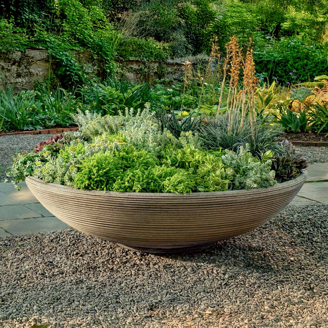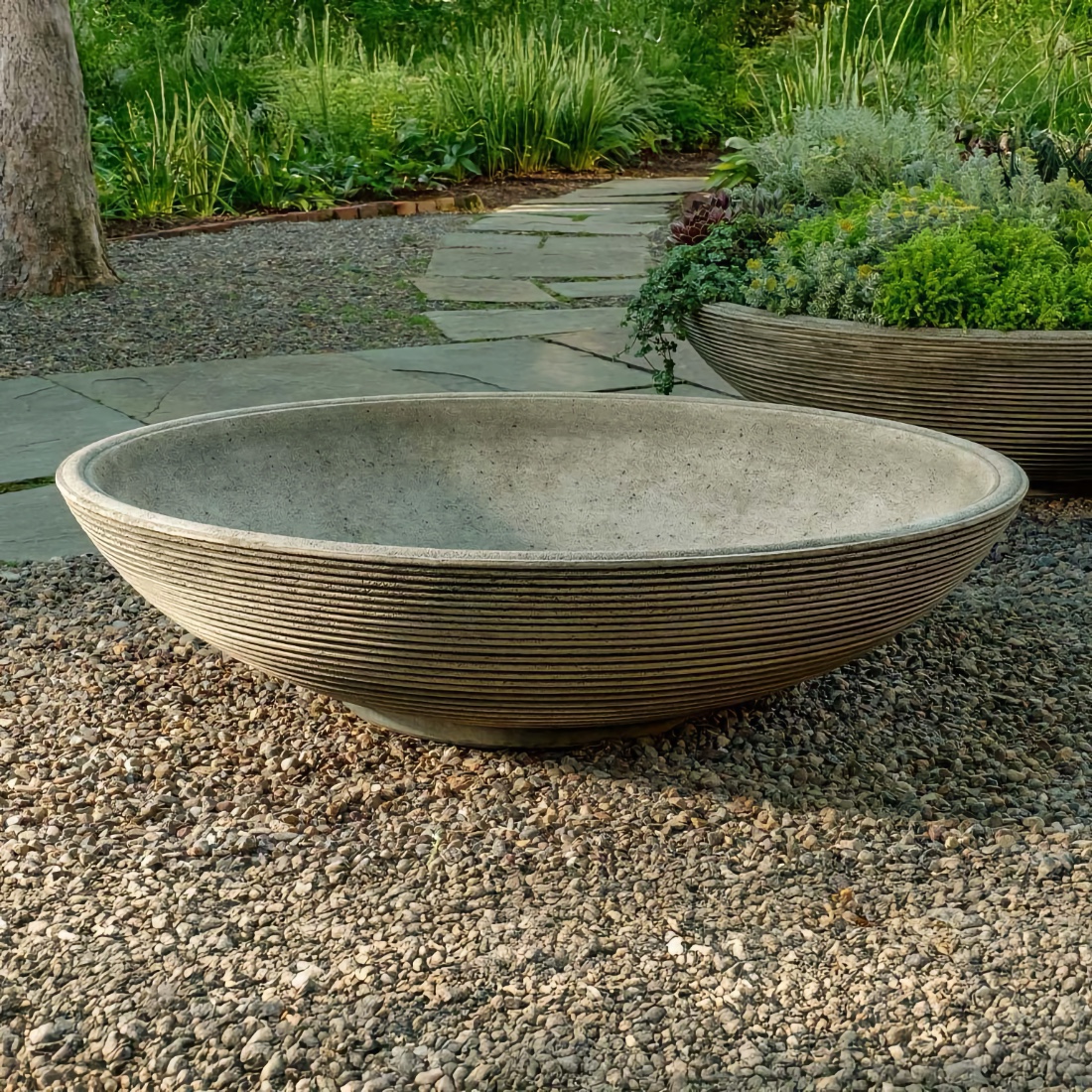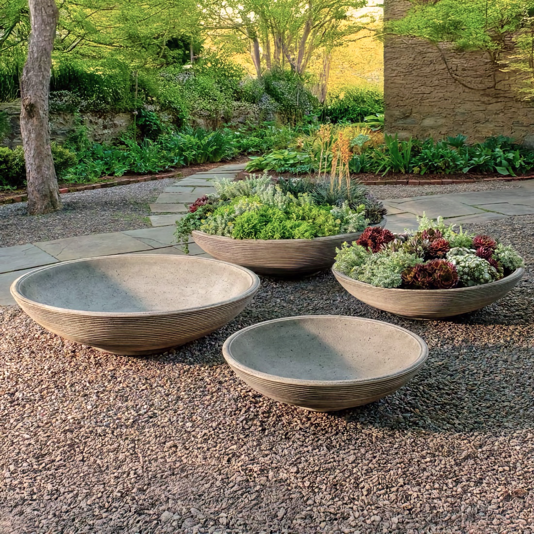 Our Enso Bowls are a stunning group classic low, wide bowl style planters. The Enso Bowls are available in four sizes, but are sold individually. They range in size from 24" diameter to a whopping 40" diameter and being cast in a very strong high density cast stone these are quite substantial planters. They are also great accents with a beautifully proportioned low profile regardless of the size of the bowl. Use them poolside, beachside, indoors, on a terrace or patio, or by a garden pathway. Using two or three sized bowls together creates a strong tiered presentation, but, they also look great each on its own. Guaranteed outdoor durability.