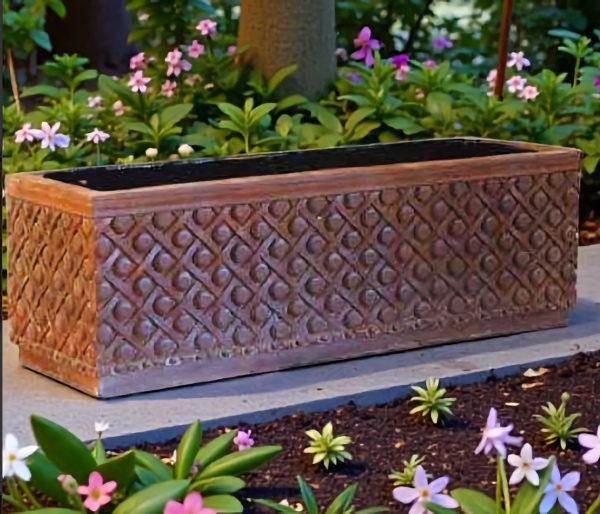 The Essex Button Window Box is a great classic window box that can also be used as a long rectangular divider, border for a garden space or for a patio , deck entrance way. Shown above in White Moss and Tuscan Rust, but, is available in all the colors shown in the chart below. Make your choice by selecting your finish in the finish/colors options list by the "Add to Cart" button. Finishes are hand applied and may vary, making each piece unique. This distinctive window planter box is meticulously hand cast and hand finished in our USA foundry in extremely durable fiberstone. Fiberstone is a mixture of sand and stones cast into the surface to give the appearance of aged stone. Reinforced with a fiberglass backing, it remains lighter and less fragile than concrete. Guaranteed outdoor durability. 28" W x 9" D x 9" H