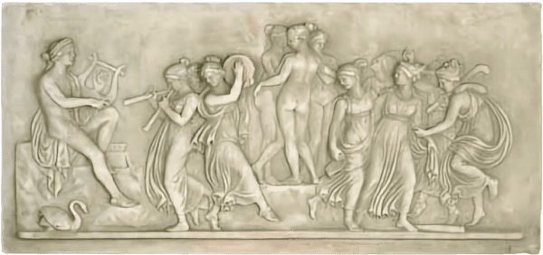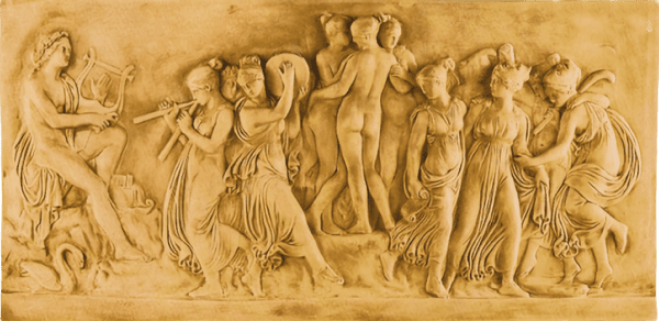 The Grand Apollo & The Muses Frieze is a large classical Bas Relief of the Greek God Apollo with the Muses. It is impressive at over 5 feet wide and two and one half feet high. Apollo is playing the lyre while the Muse Euterpe plays the flute.