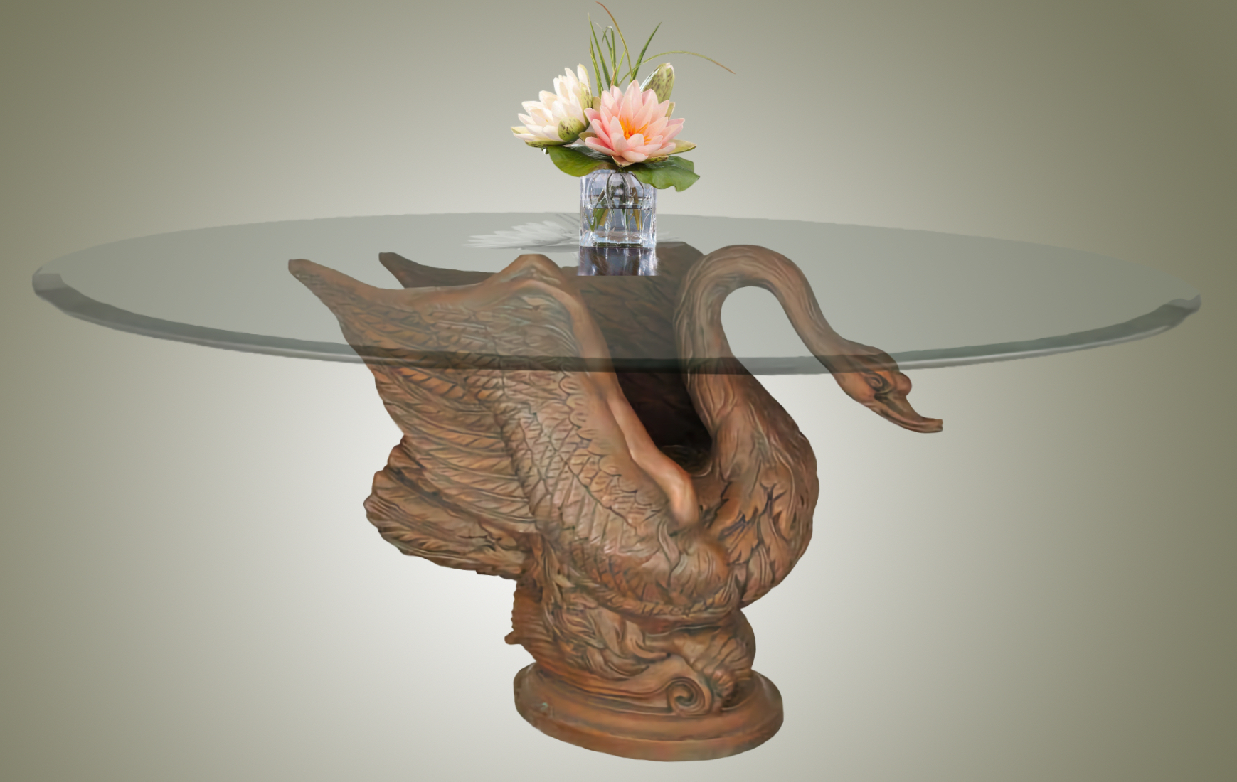 HenFeathers' PalmLa Loch Swan Table Base is a distinct addition to any deck, garden, patio or indoor room. Shown with a 36" round glass table top (not included), use indoors or outdoors with glass, stone, marble tops etc, this versatile table is great for patio, terraces, Lanais` etc.