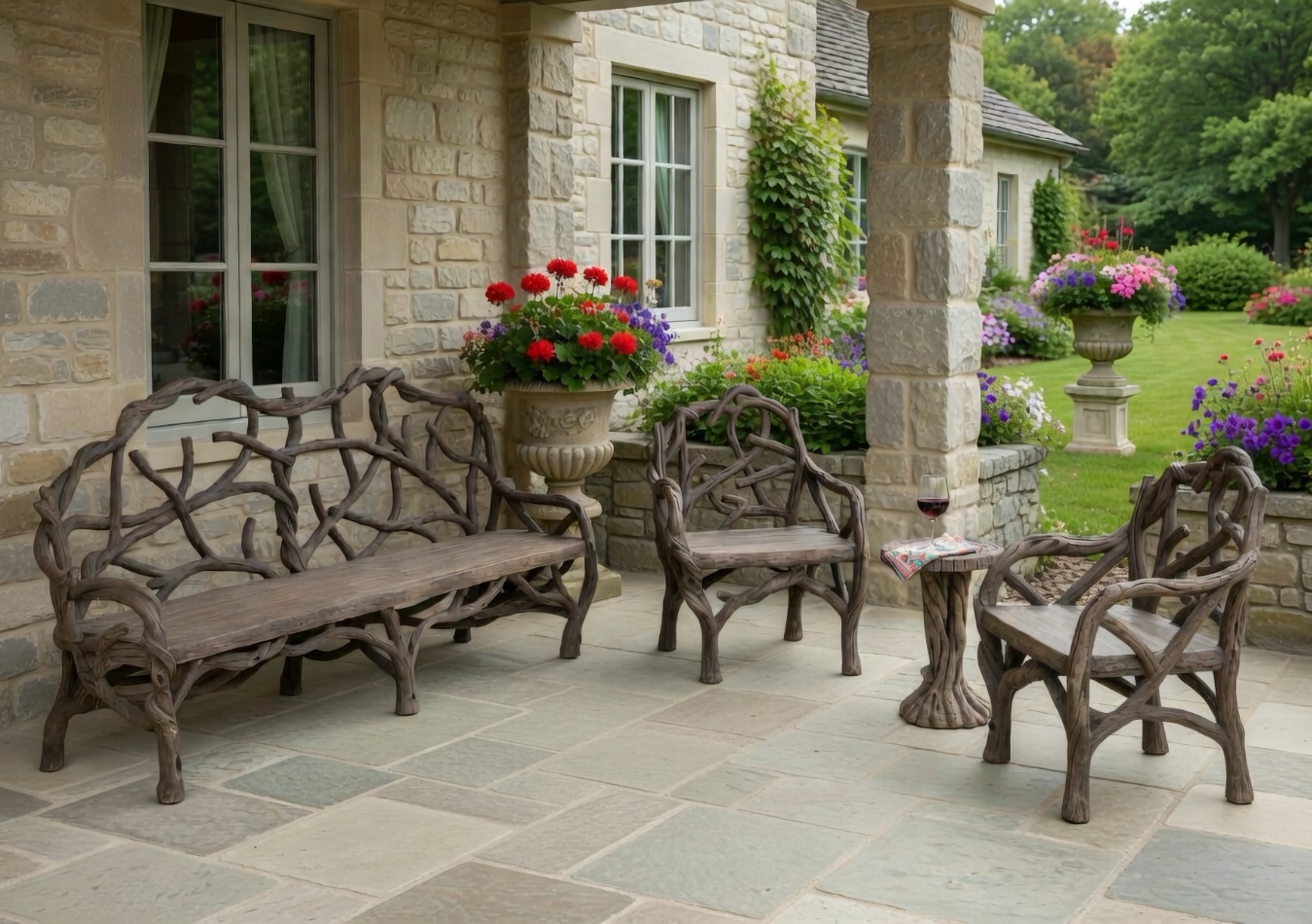 The Loire Faux Bois Large Bench with Loire Faux Bois Armchairs and the Loire Faux Bois Accent Table are just perfect for friends and family to sit and enjoy the view.Click to Enlarge