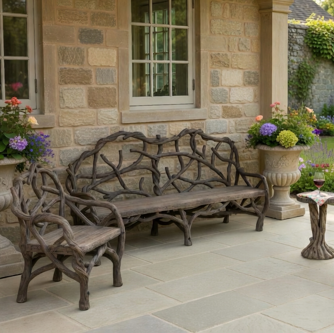 The Loire Faux Bois Large Bench with Loire Faux Bois Armchairs and the Loire Faux Bois Accent Table are unusual, beautiful and ideal for the veranda or garden.Click to Enlarge