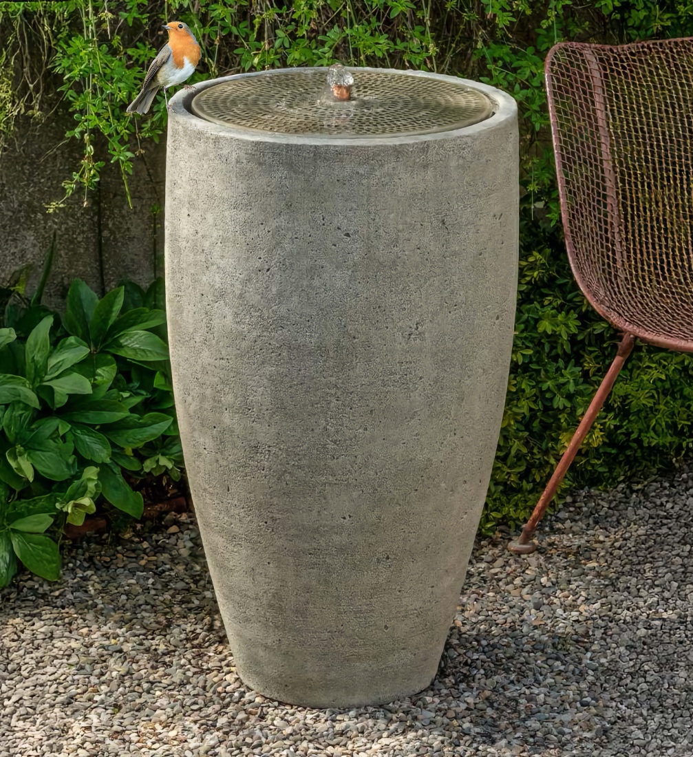 This distinctive fountain is meticulously hand cast and hand finished in our USA foundry in high density cast stone. Guaranteed outdoor durability. Our cast stone products are manufactured in the USA using locally sourced materials using the wet casting technique with a proprietary high density cast stone mix. Cast stone produces a strong and durable product that will weather naturally in an outdoor environment. Simply stated, cast stone is chosen for its beauty and authenticity. Shown in Greystone finish, but, is available in all the colors shown in the chart below. Make your choice by selecting your finish in the finish/colors options list by the "Add to Cart" button. Finishes are hand applied and may vary, making each piece unique. 18.5" Top Dia. x 33" HBase: 11" Dia.Weight: 209 lbs. | ||||||||||||||||||||||||||