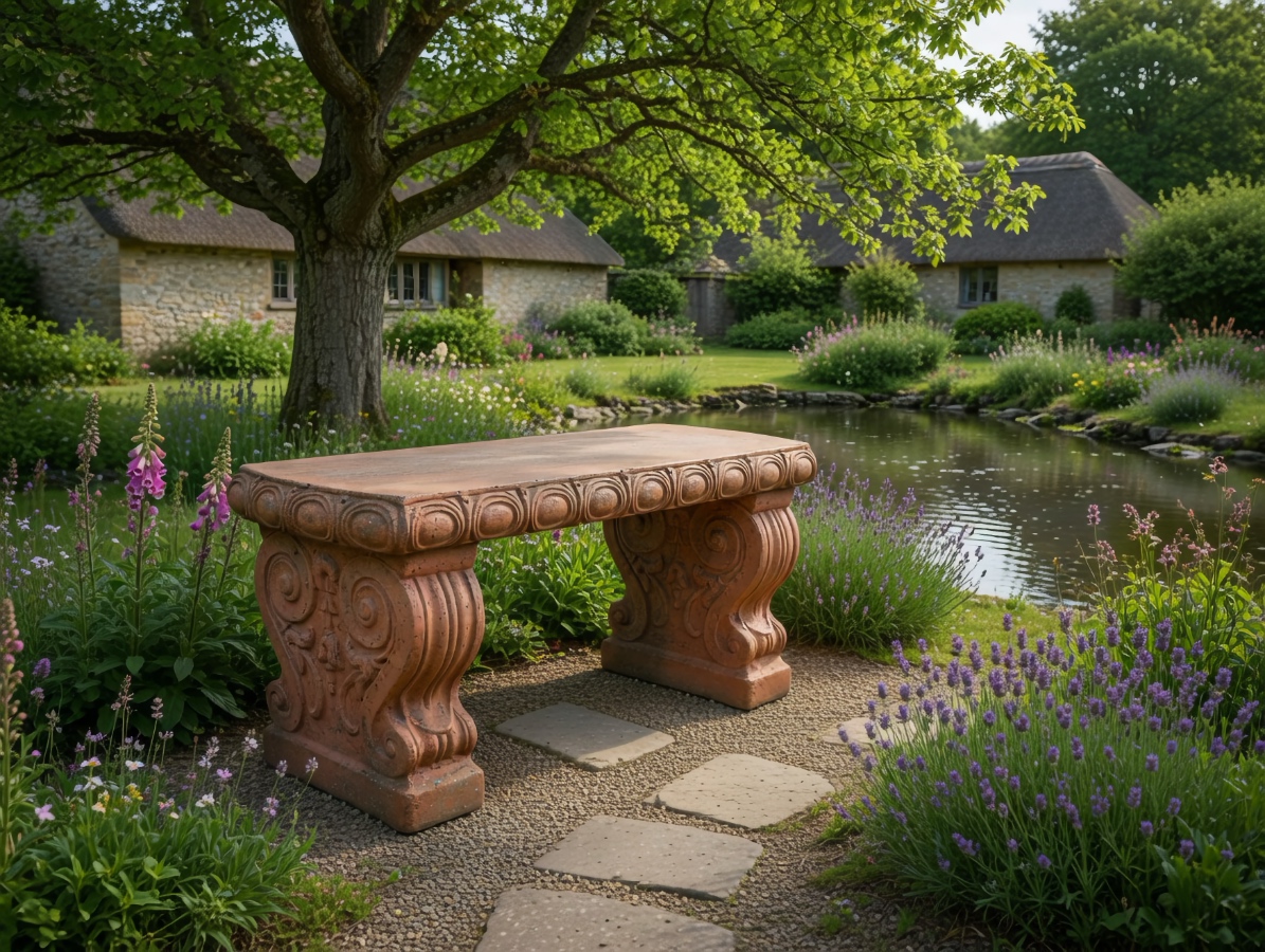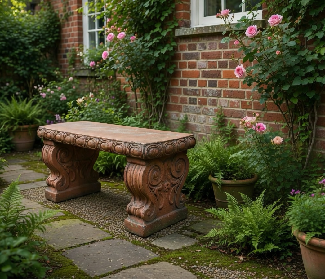 The Mayfair Garden Bench in Sandstone finish is a highlight and the perfect place to sit and enjoy nature Click to Enlarge