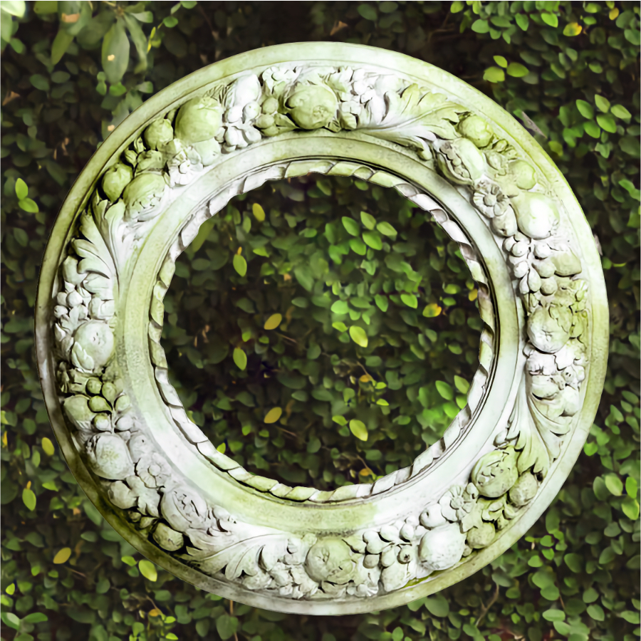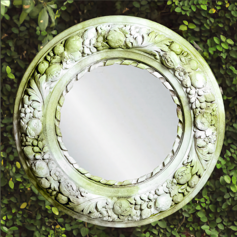This beautiful garden wall decor is also available as the Pomegranate & Acanthus Leaf Wreath without the mirror. ItŐs the same gorgeous wreath as the Looking Glass, but without the mirror. ItŐs also a great wall decor accent that can be used anywhere. The wreatsh are hand cast and hand finished in our USA foundry in extremely durable fiberstone. Fiberstone is a mixture of sand and stones cast into the surface to give the appearance of aged stone. Reinforced with a fiberglass backing, it remains lighter and less fragile than concrete. Guaranteed outdoor durability. Shown in White Moss finish but, is available in all the colors shown in the chart below. Make your choice by selecting your finish in the finish/colors options list by the "Add to Cart" button. Finishes are hand applied and may vary, making each piece unique. 43" Dia. x 6" Deep Weight: 30 lbs with mirror Weight: 25 lbs without mirror FREIGHT NOTE: In the case of extra large designs which exceed FedEx ground requirements and must ship by Freight Carrier, there is an additional Freight/Truck charge based upon your zip code location that will be charged at the time of shipment. Please call with questions 610 649 4078. | |||||||||||||||||||||||||||||||
