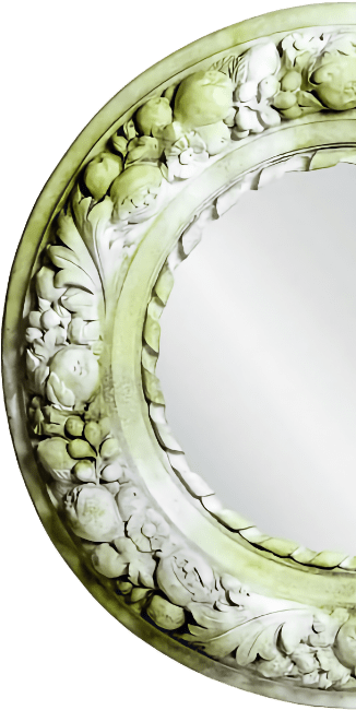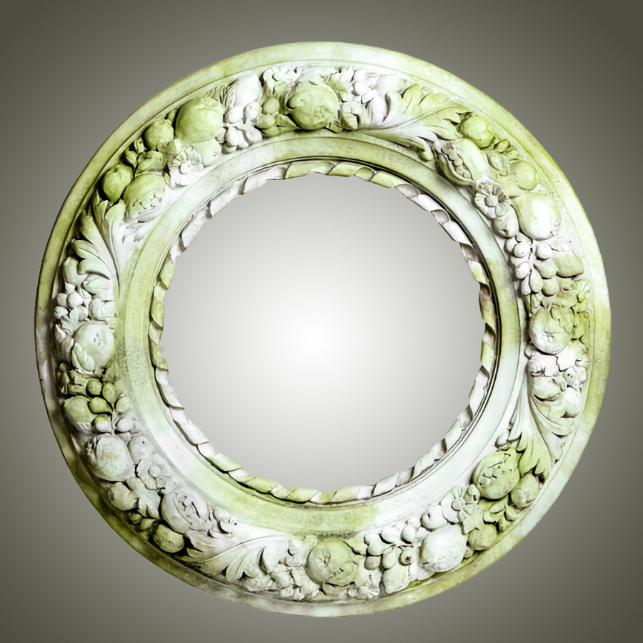 Check out this Garden Looking Glass, a one-of-a-kind piece in the HenFeathers collection. ItŐs a big wreath with a mirror in the center. The wreath is made of beautifully carved pomegranates and acanthus leaves. ItŐs not only pretty but also eye-catching. Plus, itŐs huge, measuring over three and a half feet across. This unique wall art looks great on a veranda, swimming pool deck wall, or garden wall. It can also be used indoors in almost any setting.