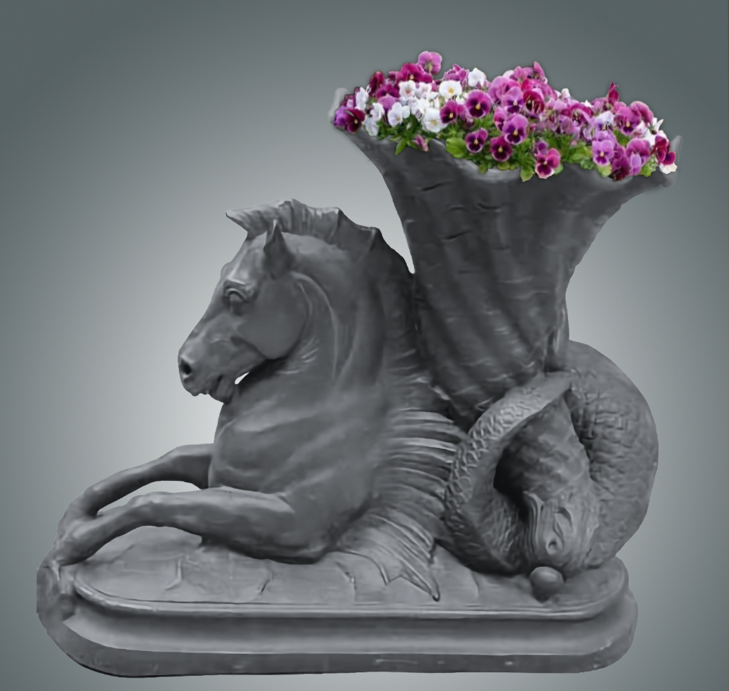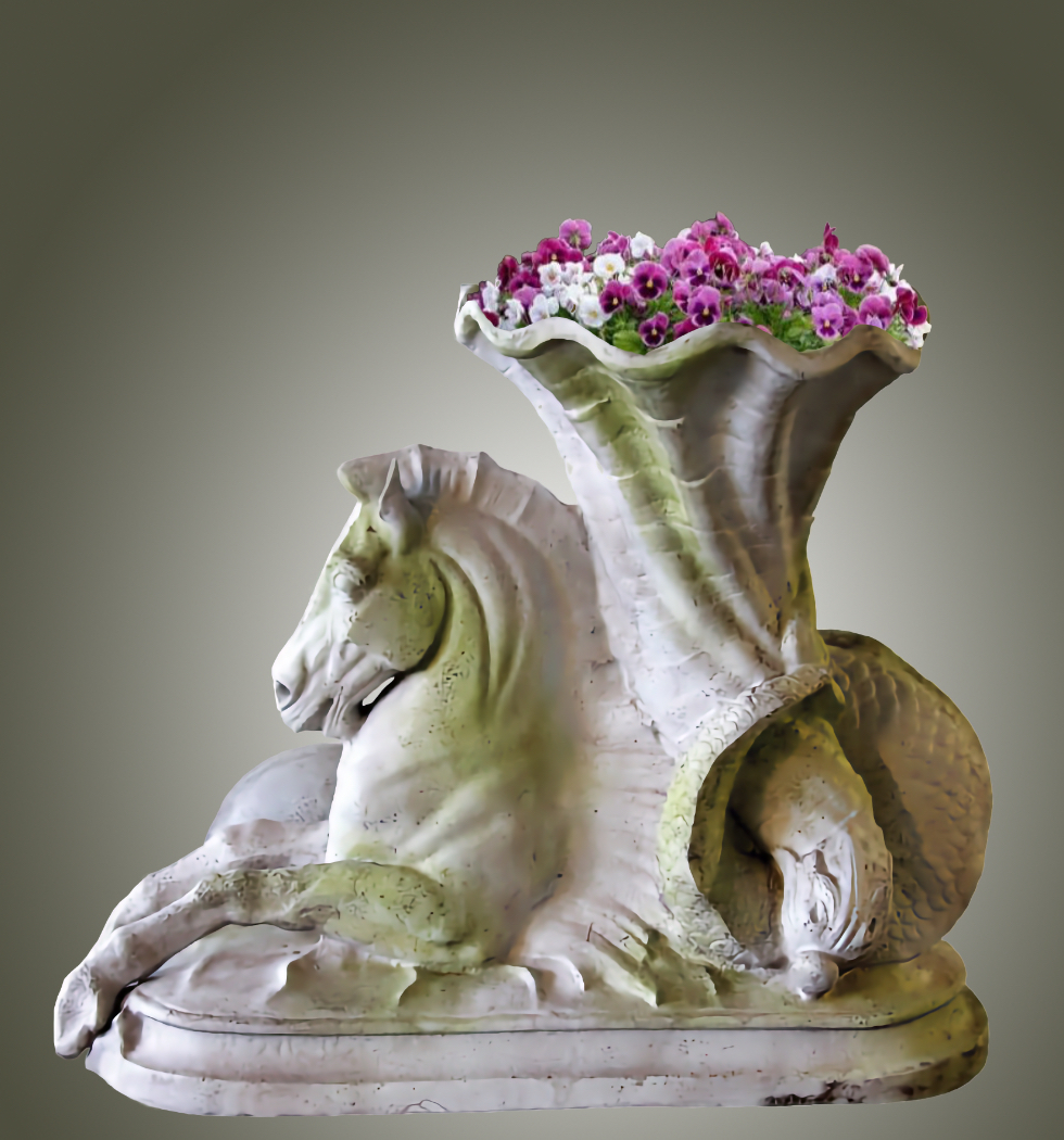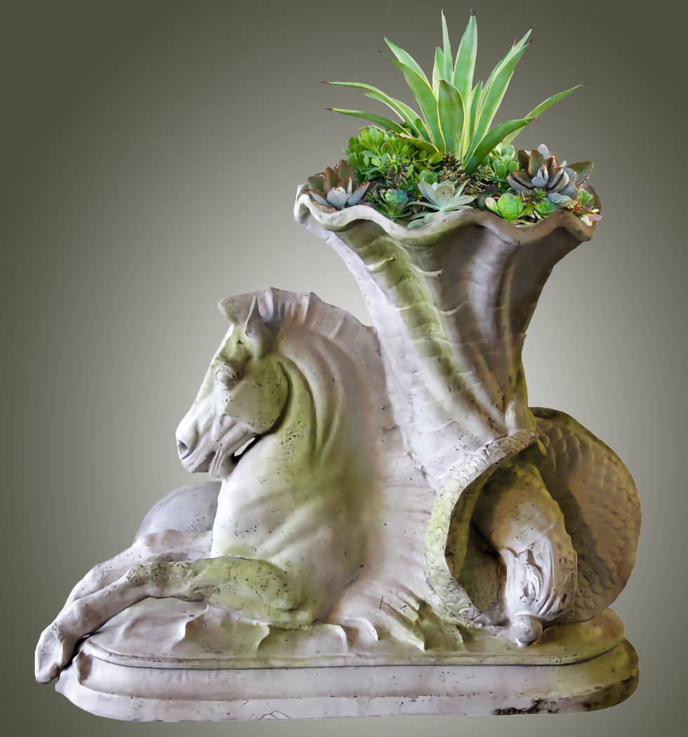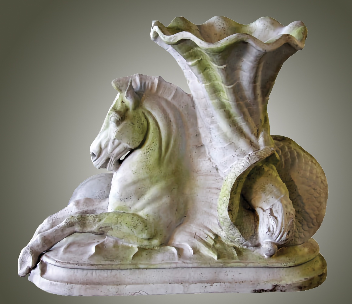 Our Ravello Seahorse of Plenty is an elegant planter in the shape of a seahorse holding large cornucopia shell in its mer-horse tail. It is a beautifully executed design of nature's most graceful seahorse. The horse's head is extremely well sculpted. The Ravello Seahorse of Plenty makes it a standout planter and are a wonderful addition to any indoor or outdoor garden setting. It is also quite large at three feet in length and over two and one half feet high.