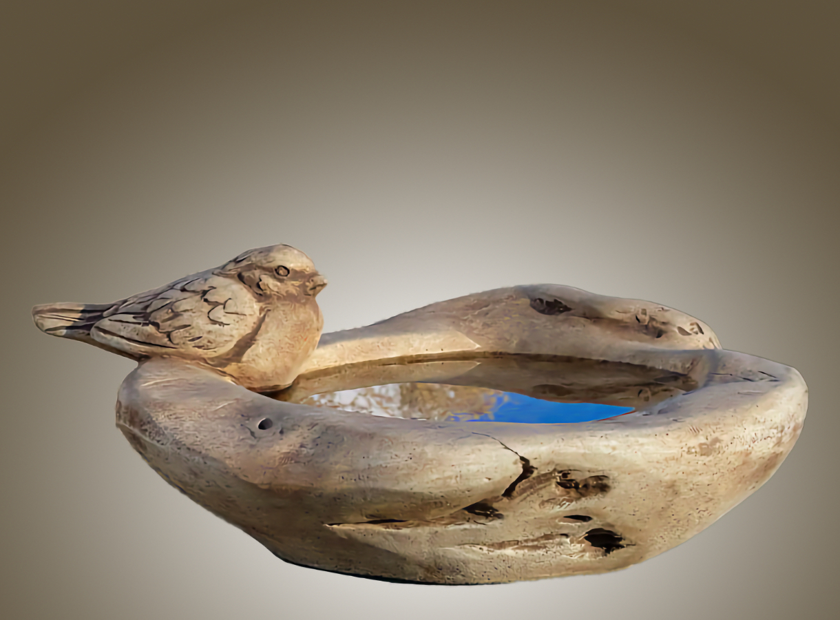 The Robin(son) Crusoe Birdbath is a natural cast stone design of a small natural stone pool. A bird perches overlooking the natural pool. It makes the perfect gift for the bird lover for any holiday. Fill with water and place on a veranda table for our avian friends.