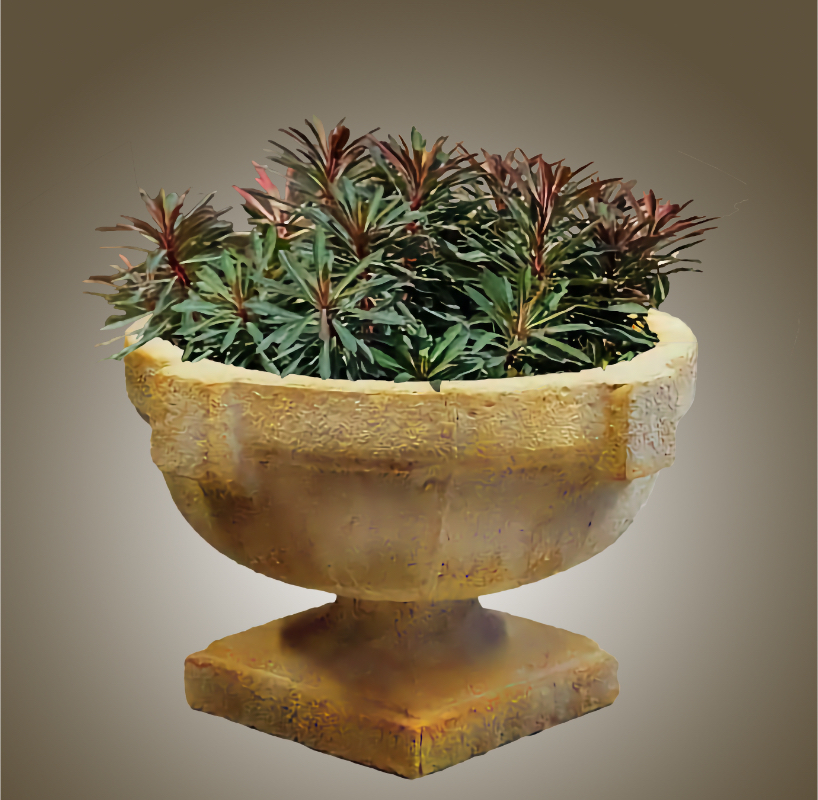 The Rustic Country Urn is the perfect urn for the country estate or lodge. While it has a Grecian flavor with the four rectangular projections about the lip of this footed urn, its rough hew texture is its defining feature. A classic bowl body on a short foot rests on a square base. This urn has a one foot 4 inch inner diameter which makes it ideal for florals, greens, succulents and ivies..