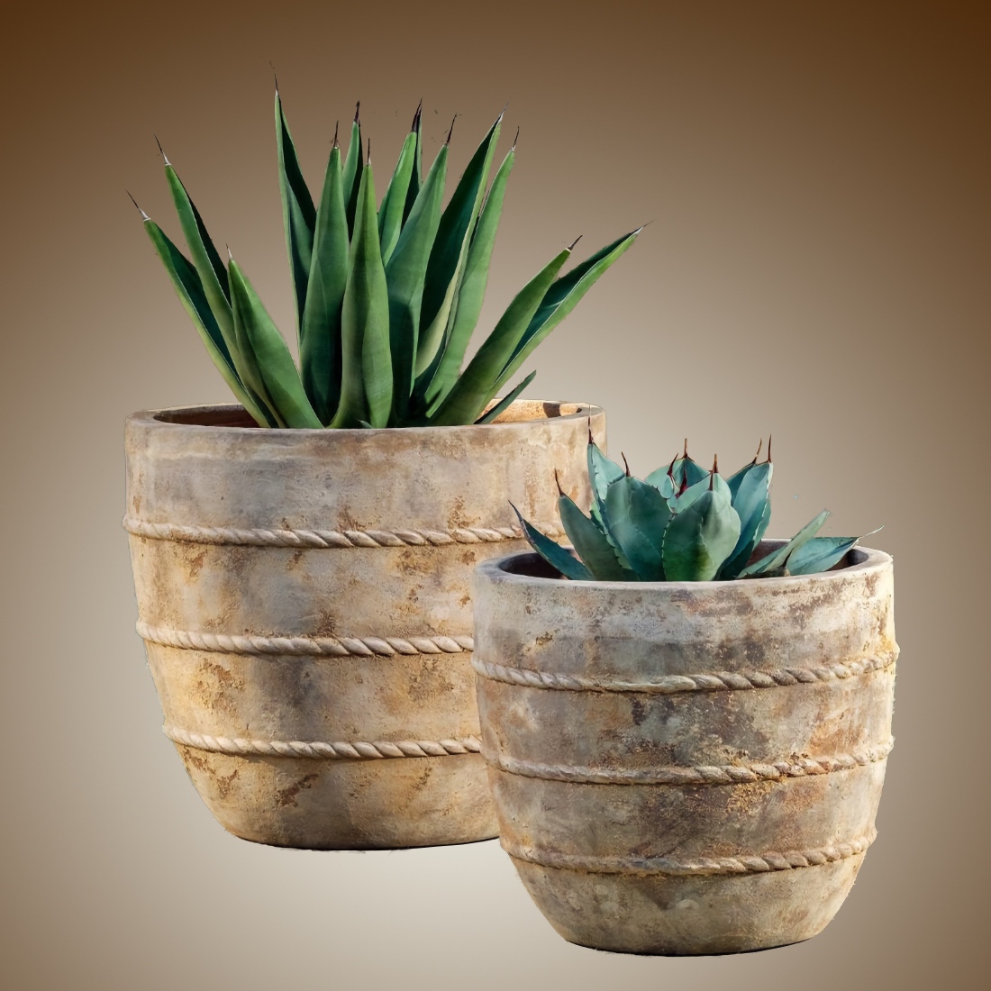 The Santorini Planters are a set of two gorgeous pots with rich, multi-layered glazes. Each set has its unique version of the beautiful Terra Cotta glaze or the Antico Terra Cotta glaze, Both glazes are beautiful. deep, layered patinas of aged terra cotta that are just stunning. Each set consists of two pots, from the large one thatŐs about one and 1/3 feet in height to the smaller one thatŐs just over one foot in height. Together, they make a beautiful tiered arrangement and are perfect for poolside, verandas, patio corners, and pretty much any indoor/outdoor garden setting. You can use them together in a grouping of two or individually, either way makes a special statement. You can also use them to define a walkway or entrance or as a divider in a larger setting.