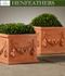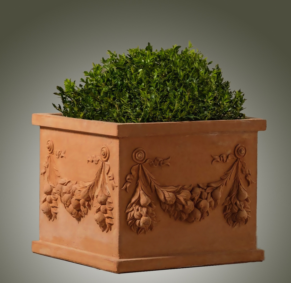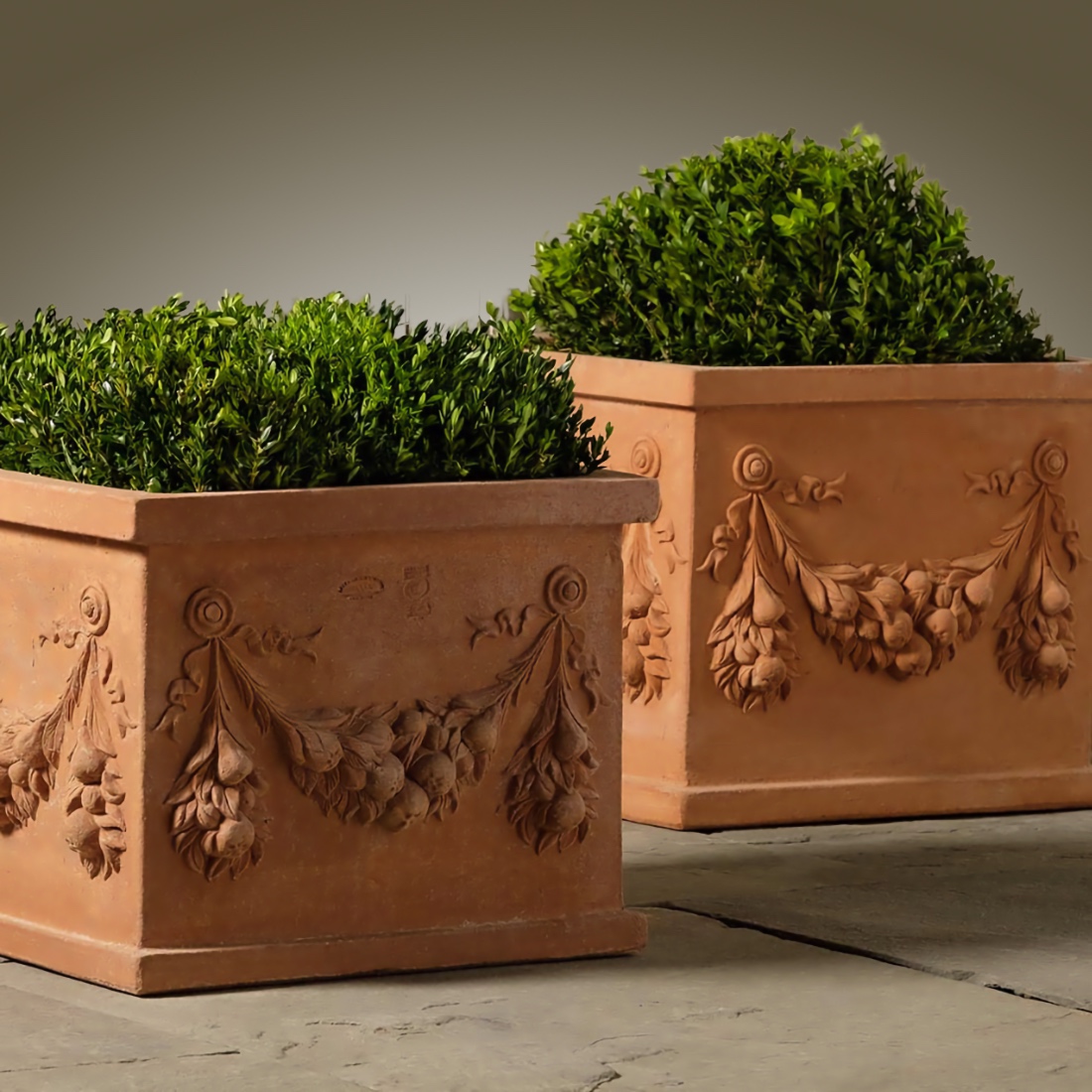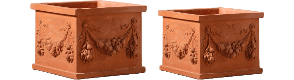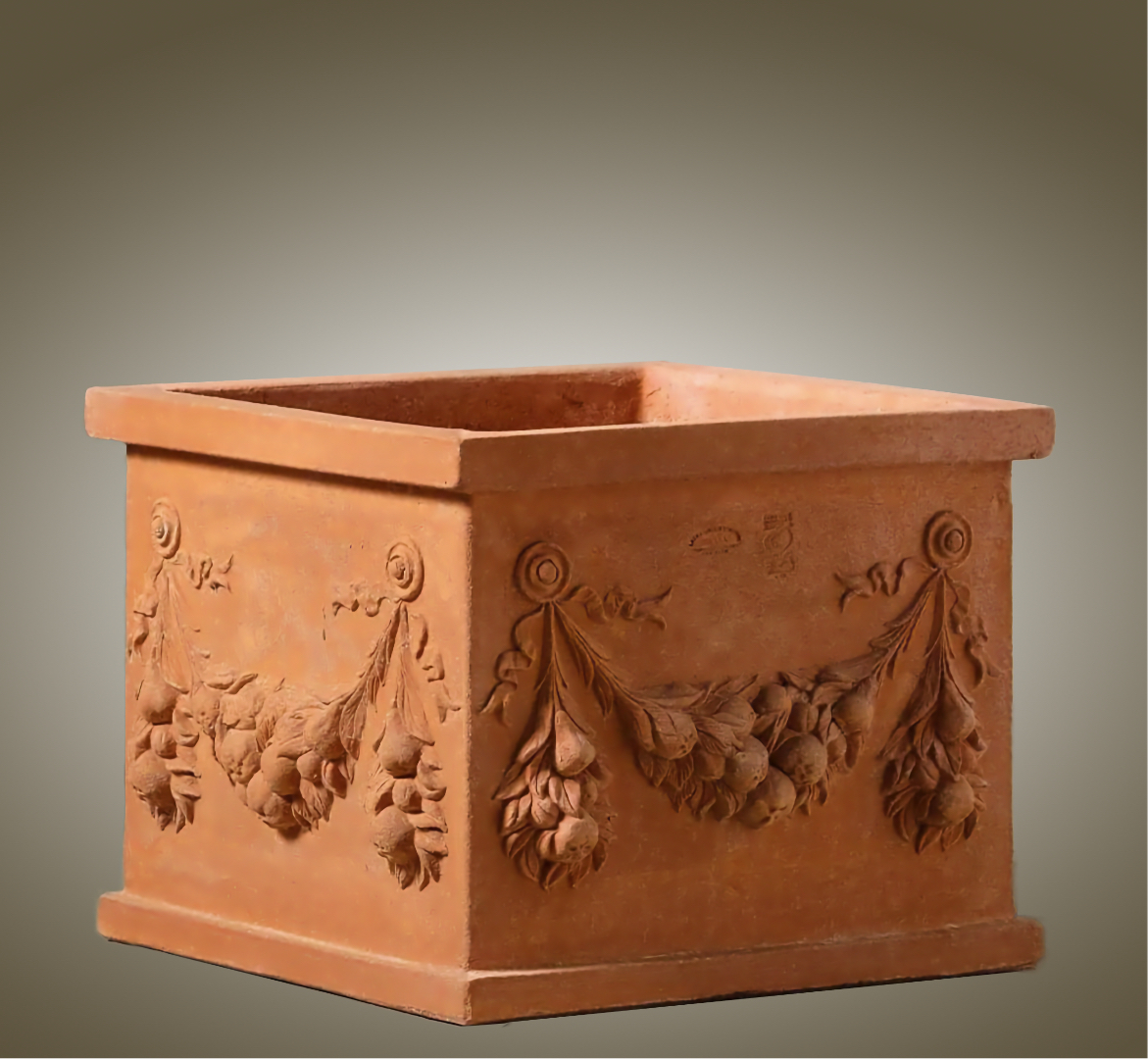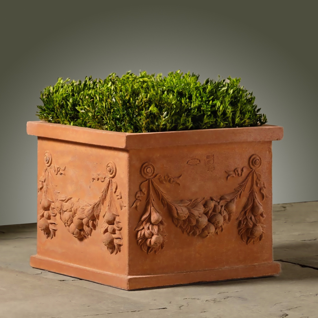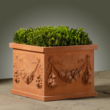 The Square Garland Planter is an exquisite terracotta box planter that is handmade in Impruneta, Italy. These beautiful box planters feature a fruit garland design in on each square facing. An extremely handsome piece expertly finished by today's brilliant craftsmen in Impruneta using fine tools and requiring enormous skill and patience. These pots are distinguished by their clean simple lines and are frost proof to -20° F. This is an exquisitely detailed small terra cotta container. Match with Small Square Garland Flower Box (see below).