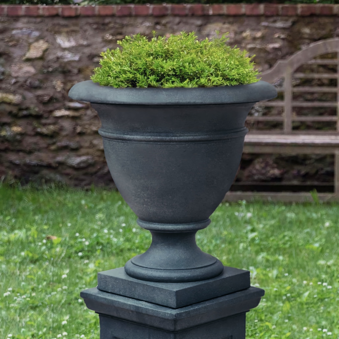 This distinctive urn is meticulously hand cast and hand finished in our USA foundry in high density cast stone. Guaranteed outdoor durability. Our cast stone products are manufactured in the USA using locally sourced materials using the wet casting technique with a proprietary high density cast stone mix. Cast stone produces a strong and durable product that will weather naturally in an outdoor environment. Simply stated, cast stone is chosen for its beauty and authenticity. Shown in Lead Antique , but, is available in all the colors shown in the chart below. Make your choice by selecting your finish in the finish/colors options list by the "Add to Cart" button. Finishes are hand applied and may vary, making each piece unique. 24" Dia. x 26" H NOTE: Freight Shipping included with these designs.