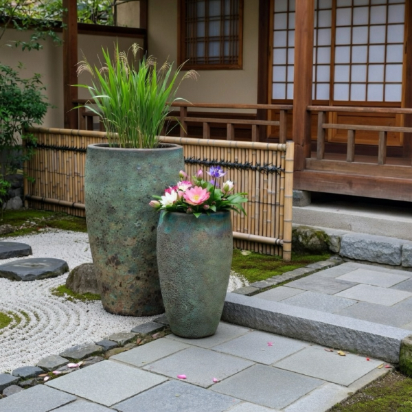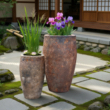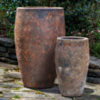 The Ta Som Planters are large, extremely attractive vessels, accented with a rich multi layered glaze patinas. In the HenFeathers collection of glazed pottery, it's all about the patina and the Ta Som Planters are great examples. The planters come in two rich glazes; Angkor and Angkor Green Mist. Both are exquisite. These incredible vases are available as a set of two: the larger one is over two and one half feet high and the smaller almost two feet in height. They are perfect for poolside, verandas, patio corners, backyard zen garden and practically any indoor/outdoor garden setting. Display individually or together in a tiered arrangement to make a special statement. Meticulously hand made and hand finished in high fired terra cotta. Only available in the beautiful rich glazes as shown.