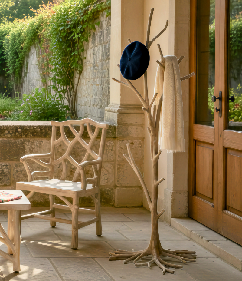 Using the Brookside Branch Faux Bois Table/Bench as a beautiful cocktail table with the Brookside Branch Faux Bois Side Table on the left with the Bois de Fontanilles Arm Faux Bois Chairs and the amazing Town & Country Faux Bois Coat Tree. Together they make an incredible and welcoming setting.Click to Enlarge