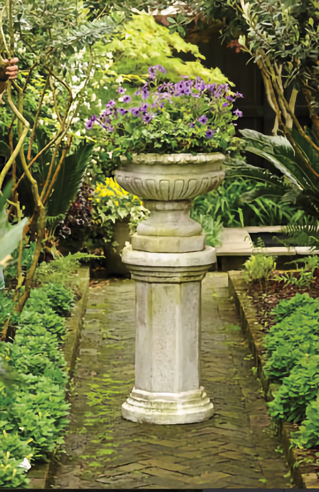 This distinctive urn is meticulously hand cast and hand finished in our USA foundry in extremely durable fiberstone. Fiberstone is a mixture of sand and stones cast into the surface to give the appearance of aged stone. Reinforced with a fiberglass backing, it remains lighter and less fragile than concrete. Guaranteed outdoor durability. Shown in White Moss and Sea Washed Stone finishes, but, is available in all the colors shown in the chart below. Make your choice by selecting your finish in the finish/colors options list by the "Add to Cart" button. Finishes are hand applied and may vary, making each piece unique. 22" Dia x 17" H Valenza Column PedestalThe Valenza Column Pedestal is a stately pedestal with a 6 sided column with a round cap and base that will work with a wide variety of mid-sized to large display objects. The pedestal has 16" diameter top surface which is ideal for use with many urns, planters and sculpture where a round base is desired. This pedestal is distinguished by its clean lines and stepped cap and base giving the pedestal its a classic modern look. A riser pedestal creates a commanding focal point in a garden niche, patio, outside entrance or an indoor entrance foyer. The Valenza Column Pedestal is the ideal base for our Toscana Urn as shown, but is it also perfect for many of our urns and planters. This distinctive pedestal is meticulously hand cast and hand finished in our USA foundry in extremely durable fiberstone. Fiberstone is a mixture of sand and stones cast into the surface to give the appearance of aged stone. Reinforced with a fiberglass backing, it remains lighter and less fragile than concrete. Guaranteed outdoor durability. The Valenza Pedestal is shown here in Sandstone, White Moss, Antique Stone and Cathedral Stone finishes (above), but, is also available in all the finishes shown below. Make your finish choice by selecting from the options list below. Finishes are hand applied and may vary, making each piece unique. 16" Dia. x 29" H 16" Top Useable Surface Base: 16" Dia.Weight: 24 lbs | |||||||||||||||||||||||||||||||