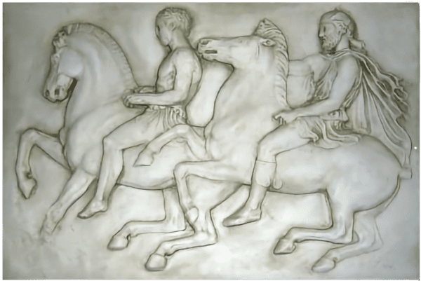 This Two Horsemen plaque is a large classical Bas Relief of two horse riders from the Parthenon Western Frieze. It is impressive at about 5 feet wide and three and one half feet high. The plaque depicts two cavalrymen in the Greater Panathenaic procession to the Acropolis. It was sculpted between c. 443 and 437 BC, most likely under the direction of Phidias. The two riders in our plaque appear to be Thracian warriors as they are wearing Thracian dress of fur cap, a patterned cloak, and high boots. The Greeks considered the Thracians barbarians, but, respected them as warriors. Most of the equestrian blocks are from the western frieze.