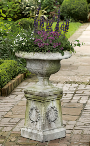 This distinctive pedestal is meticulously hand cast and hand finished in our USA foundry in extremely durable fiberstone. Fiberstone is a mixture of sand and stones cast into the surface to give the appearance of aged stone. Reinforced with a fiberglass backing, it remains lighter and less fragile than concrete. Guaranteed outdoor durability. Shown in White Moss and Antique Stone, but, is available in all the colors shown in the chart below. Make your choice by selecting your finish in the finish/colors options list by the "Add to Cart" button. Finishes are hand applied and may vary, making each piece unique. 14" x 14" x 18" H | |||||||||||||||||||||||||||||||