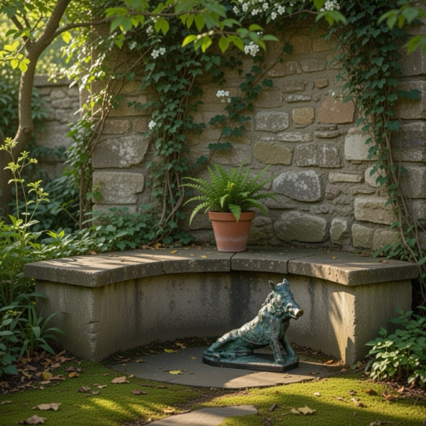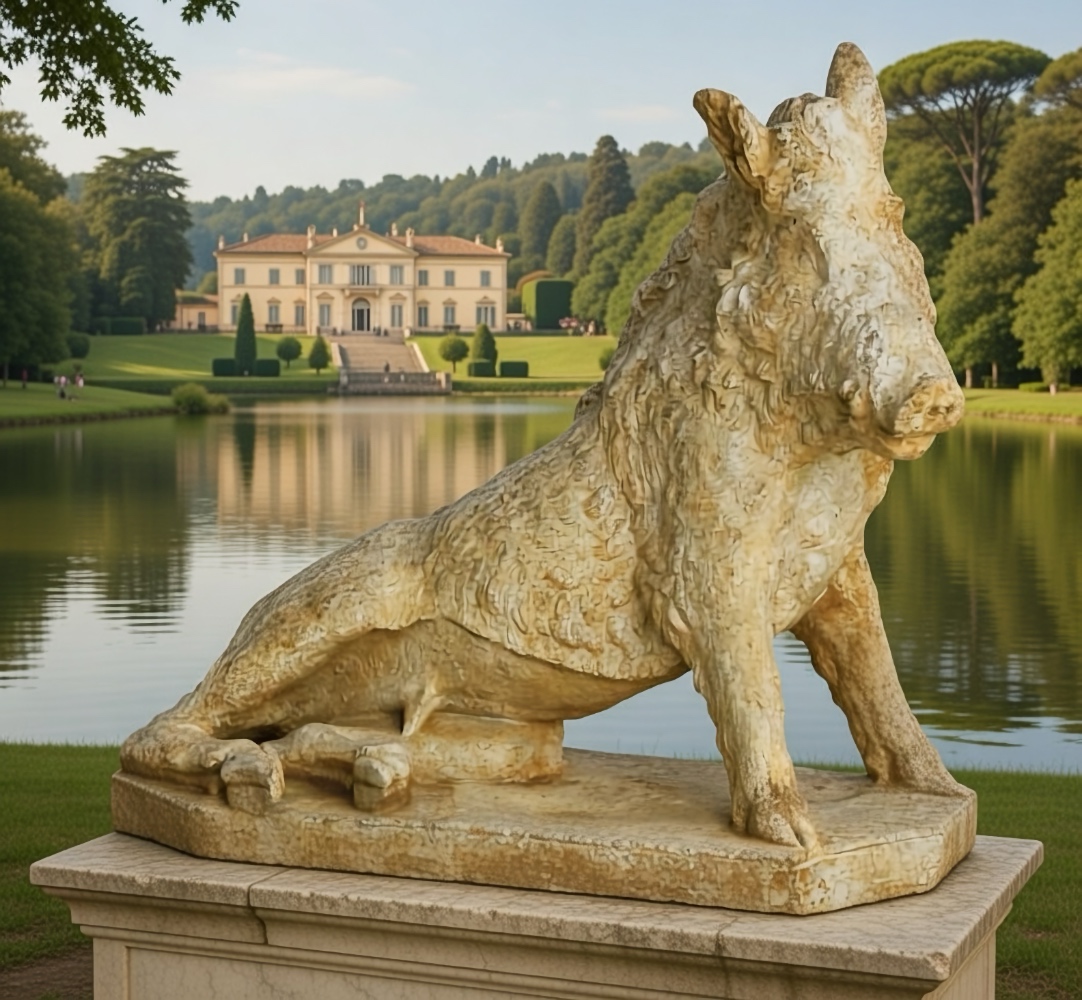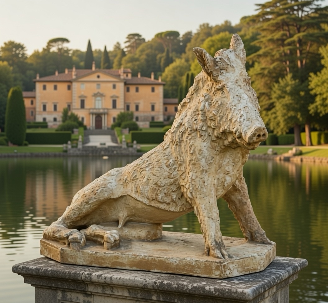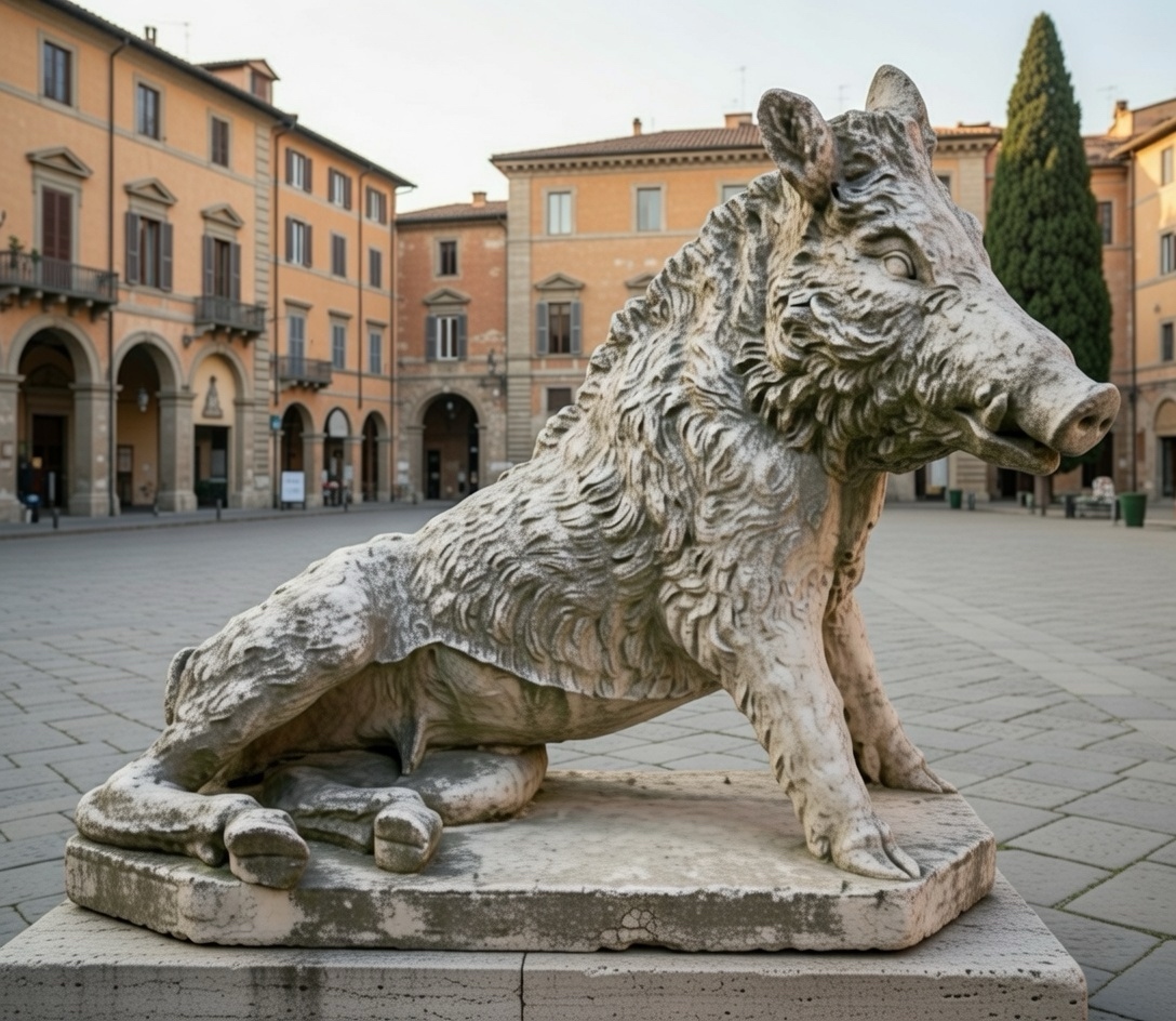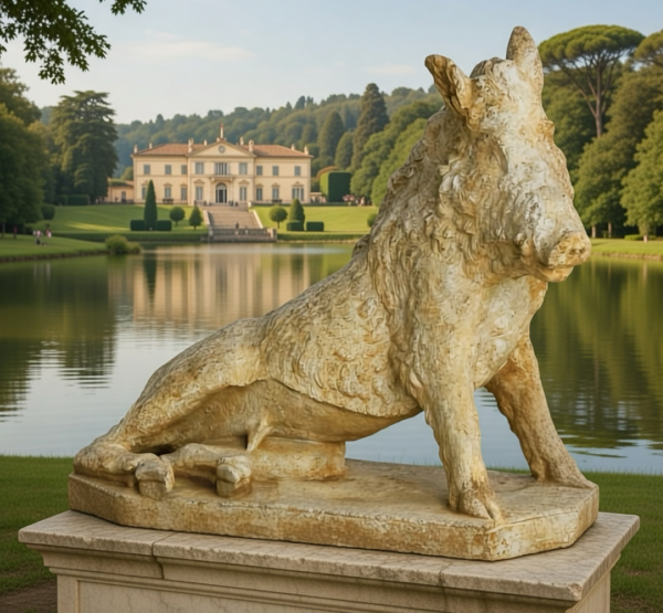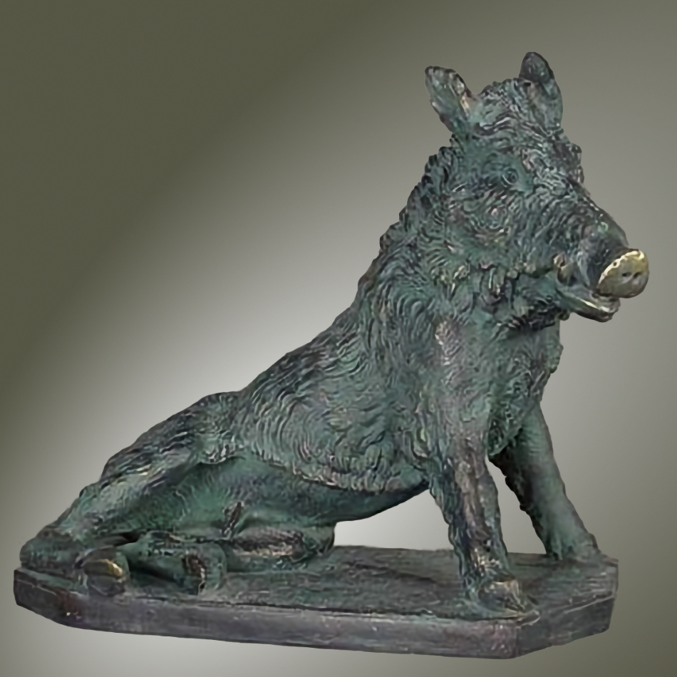 A reproduction of the Pietro Tacca boar which is itself a reproduction of an ancient greek sculpture. A marble version resides in the Uffizi Gallery in Florence, while a bronze casting is part of fountain in Marketo Nuovo in Florence as well. Il Porcellino's nose has become shiny over the years due to locals and visitors alike rubbing it for good luck.