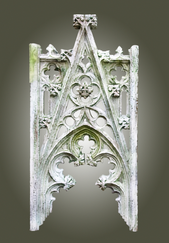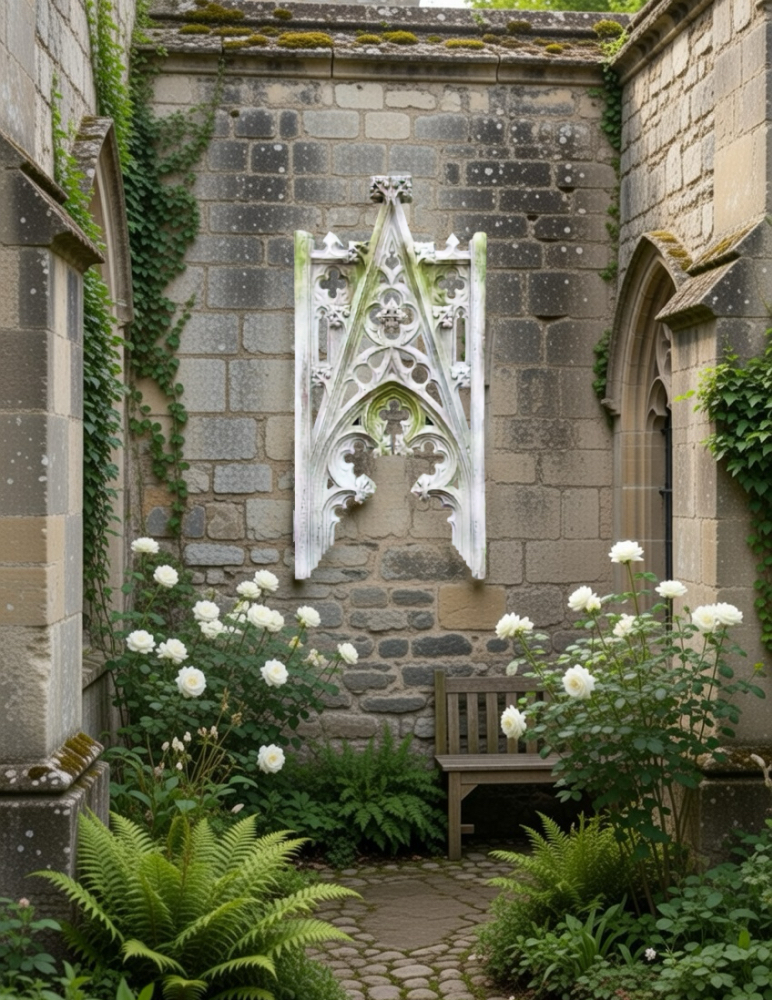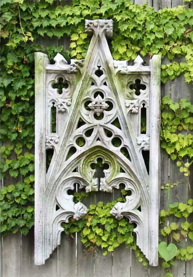 Our Windsor Tracery plaque in an imaginary setting of a Gothic garden in White Moss finish.Click to Enlarge